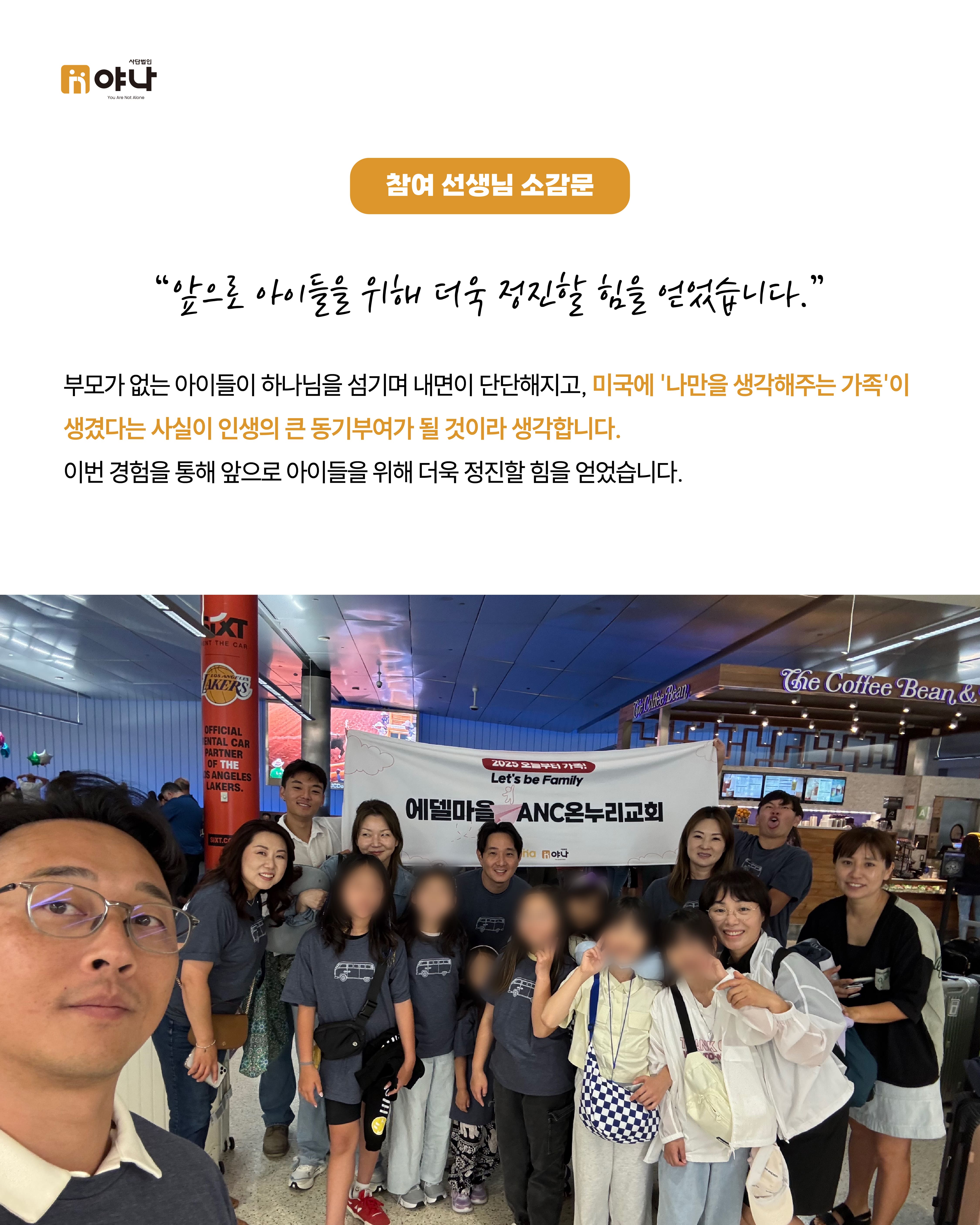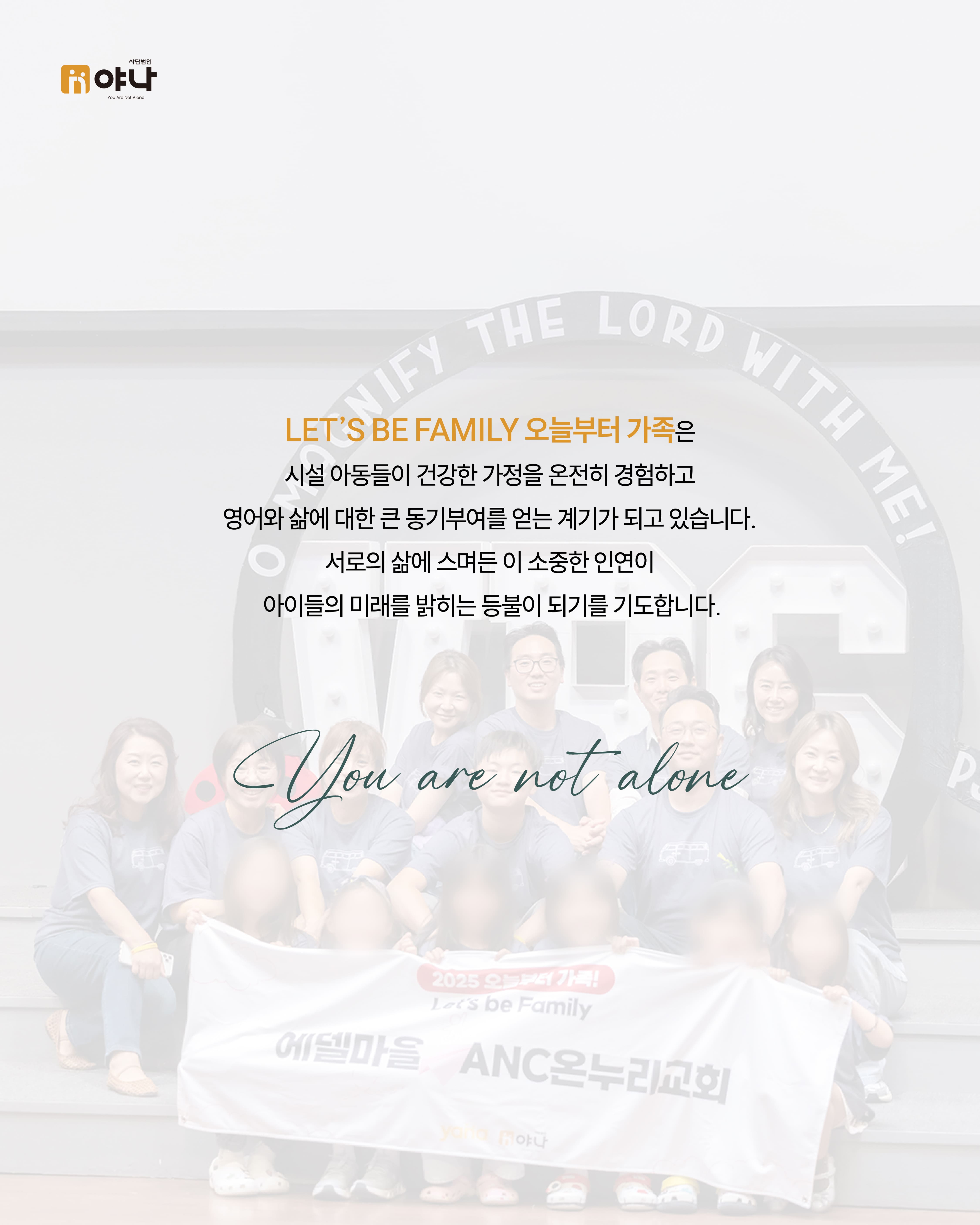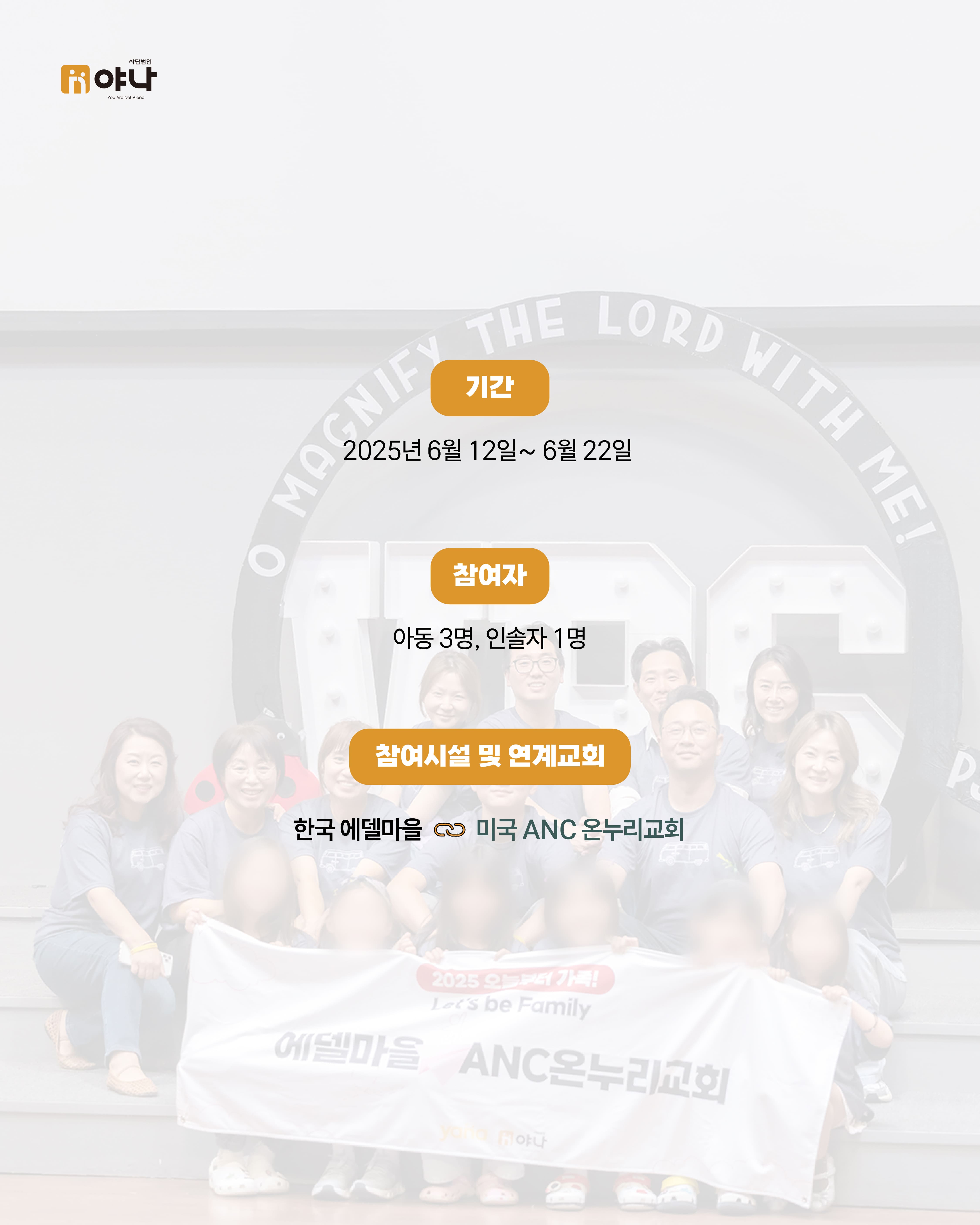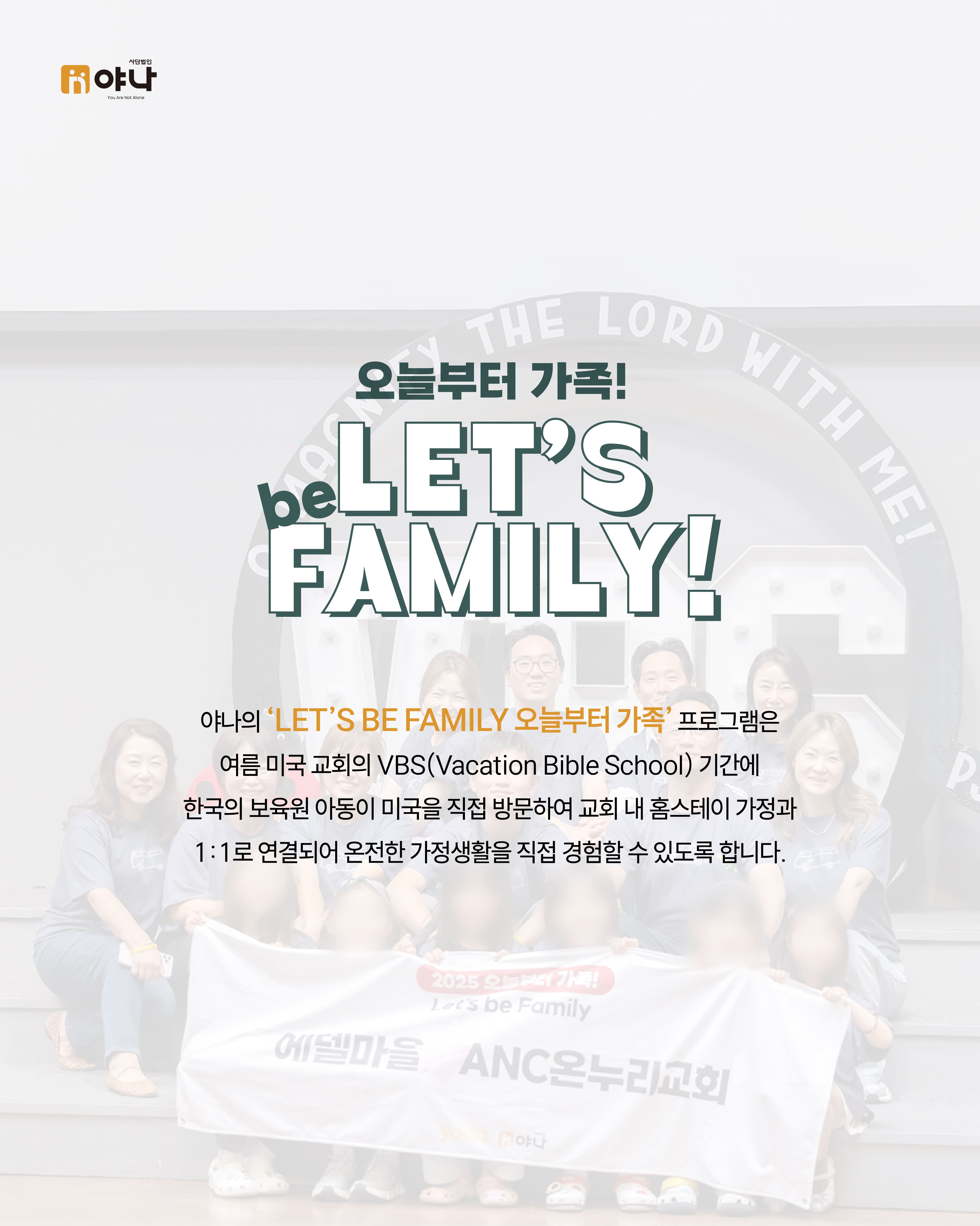 야나의 [Let's be Family 오늘부터 가족] 프로그램은 여름 미국 교회의 VBS(Vacation Bible School) 기간에 한국의 보육원 아동이 미국을 직접 방문하여, 교회 내 홈스테이 가정과 1:1로 연결되어 온전한 가정생활을 직접 경험할 수 있도록 합니다.