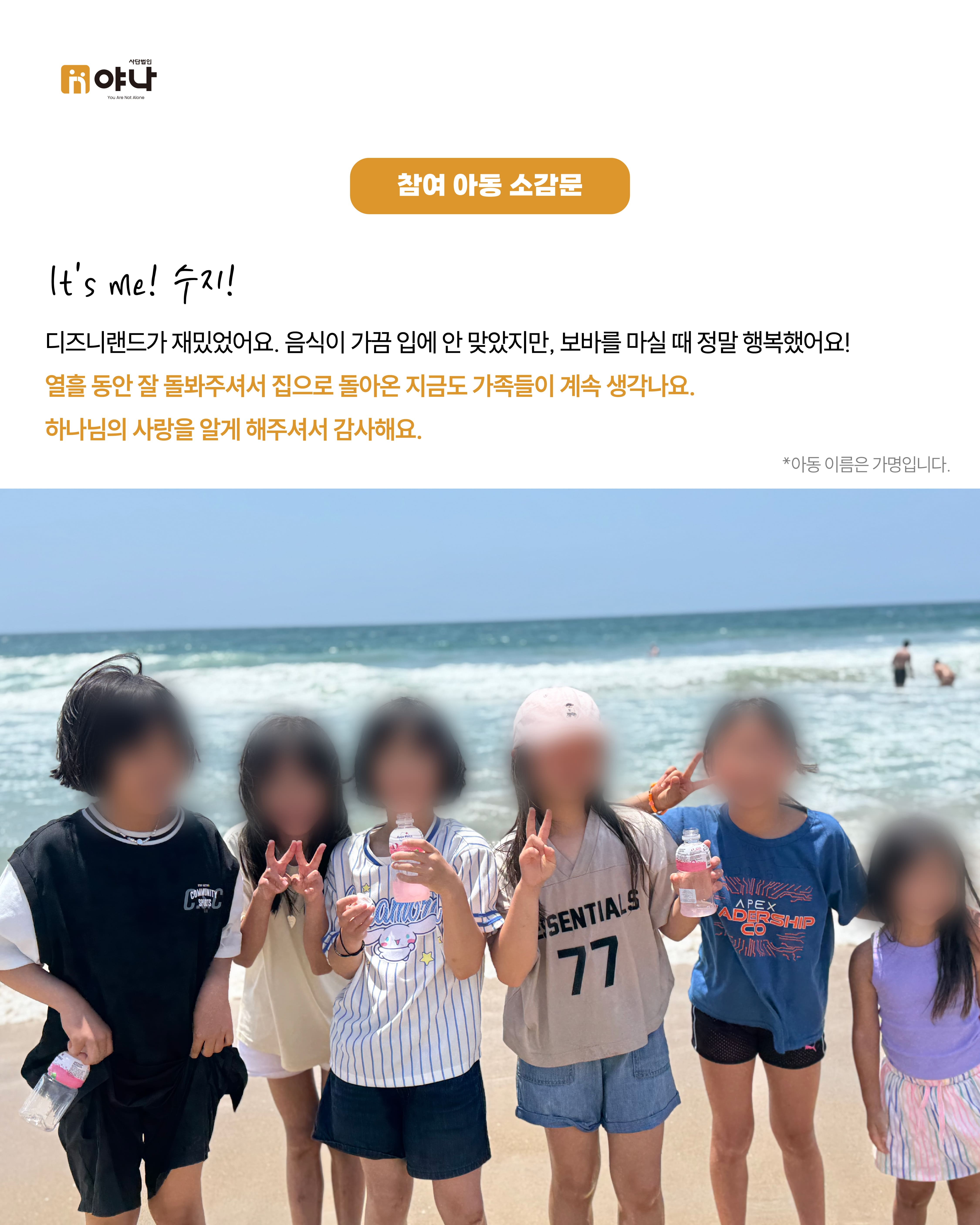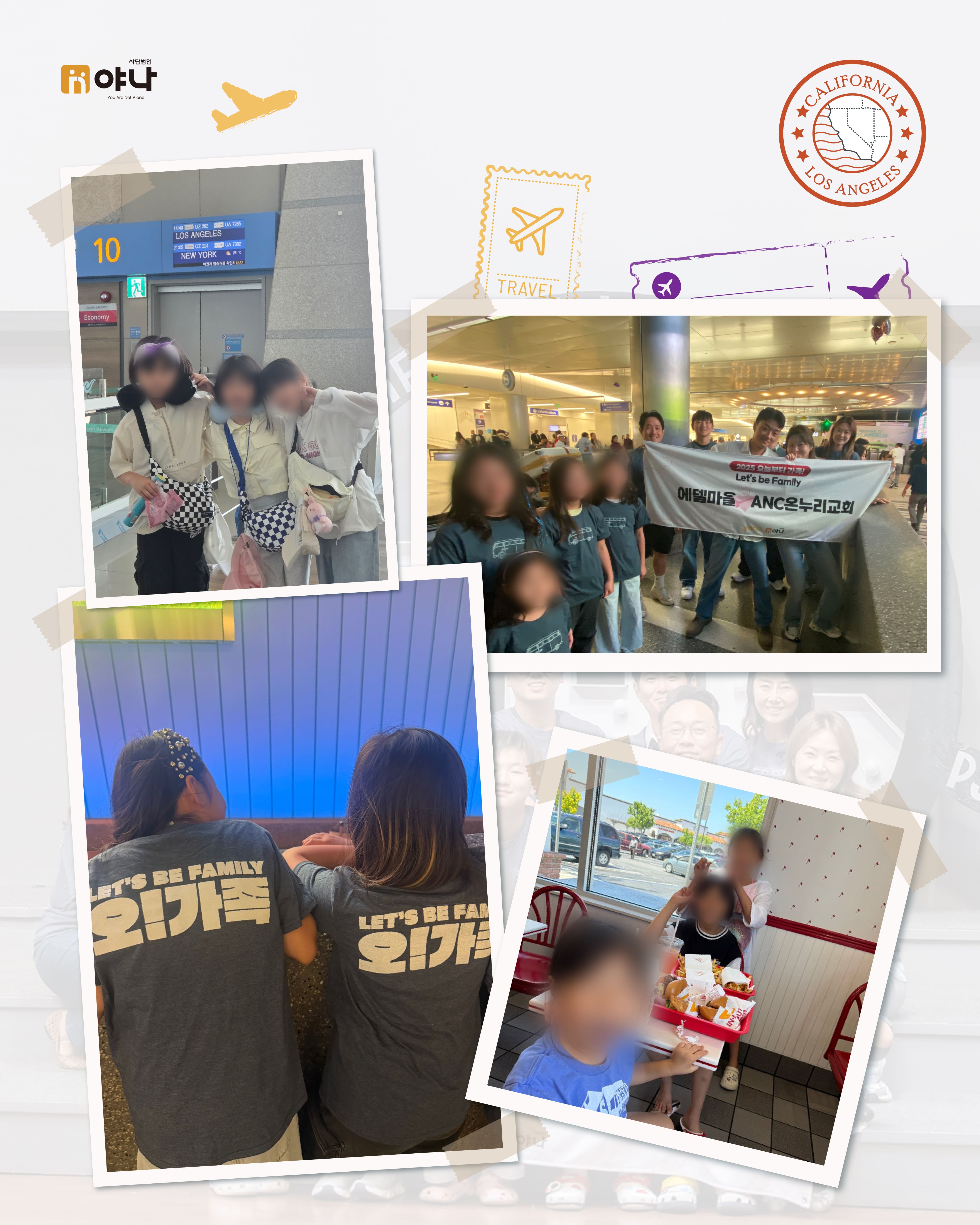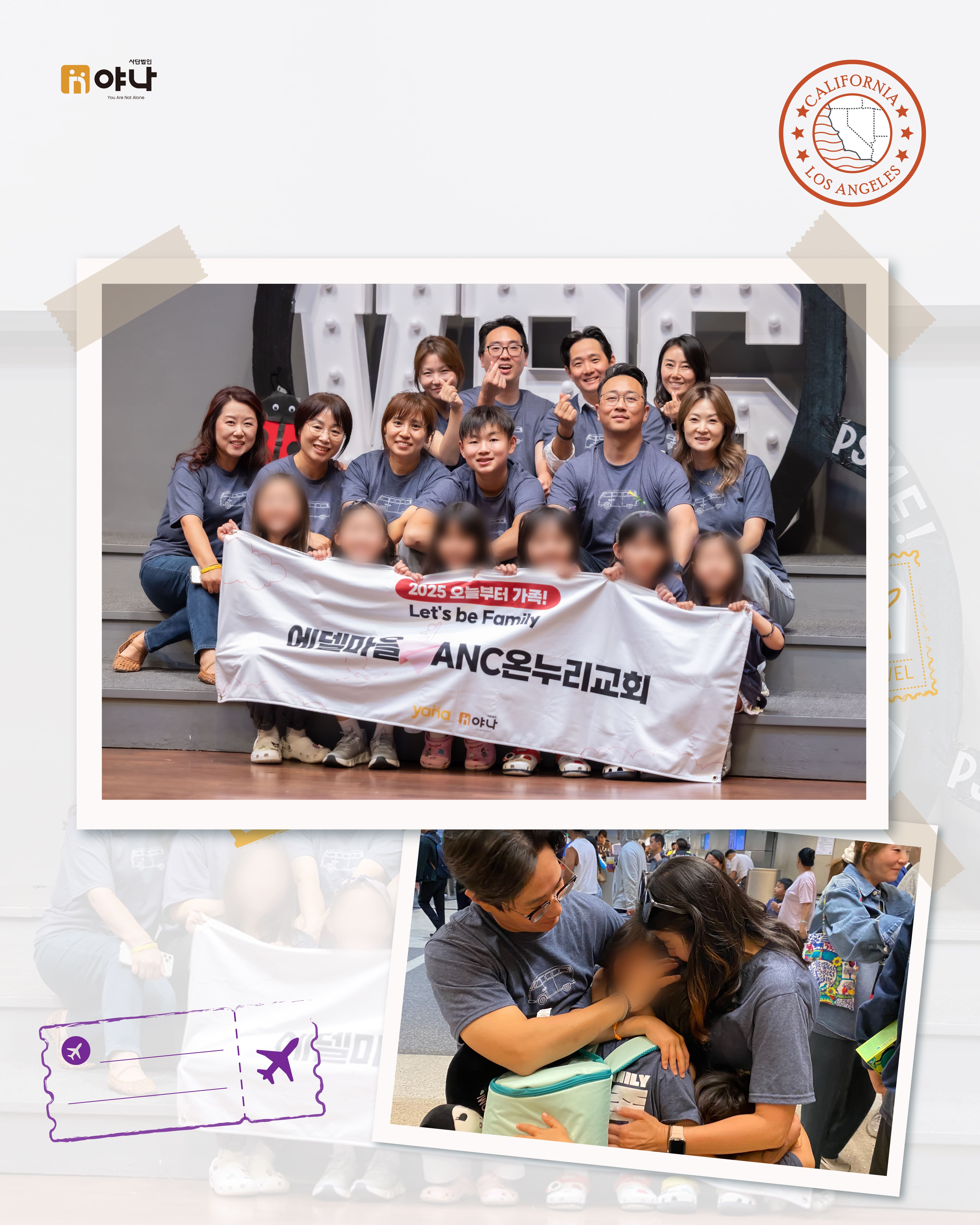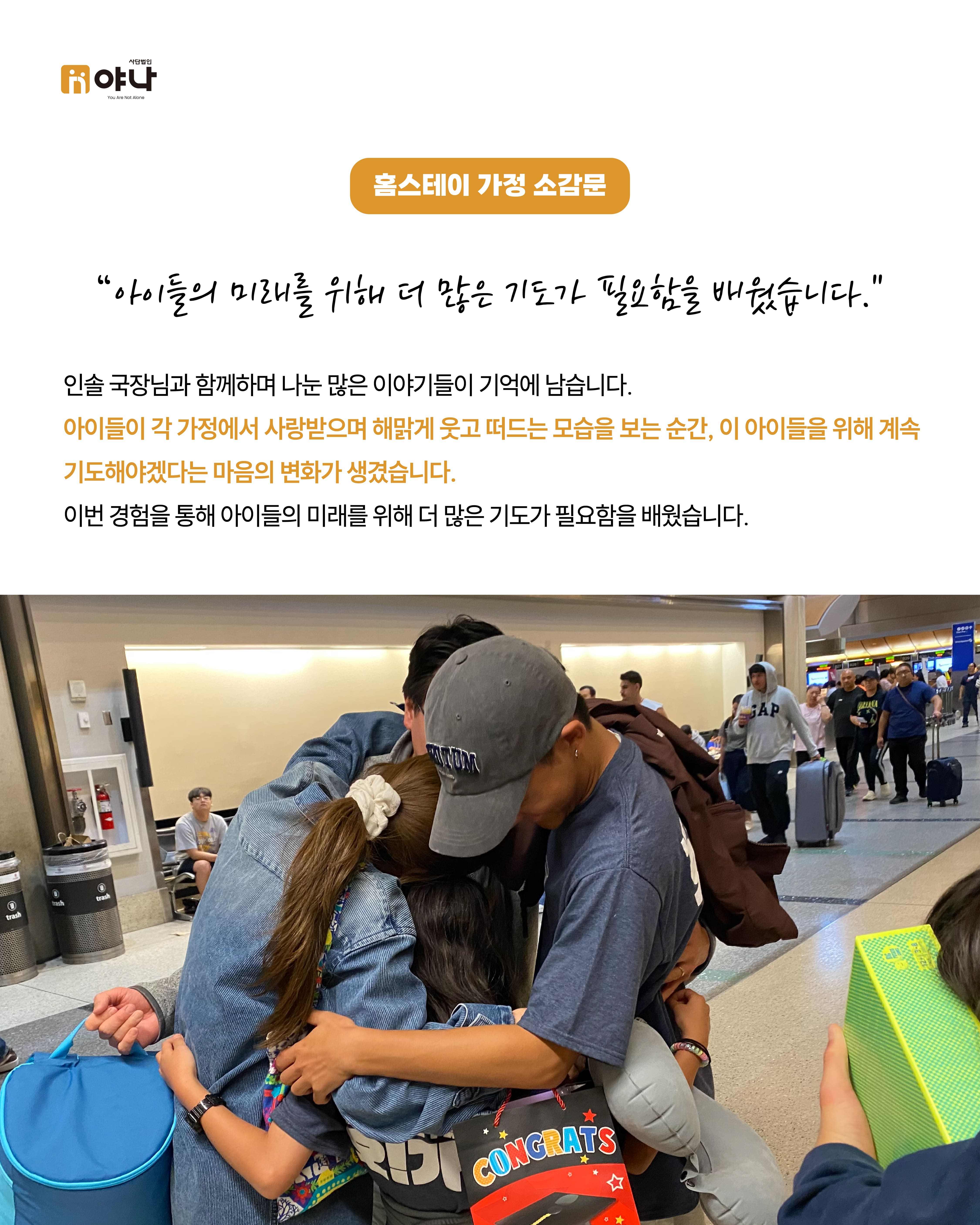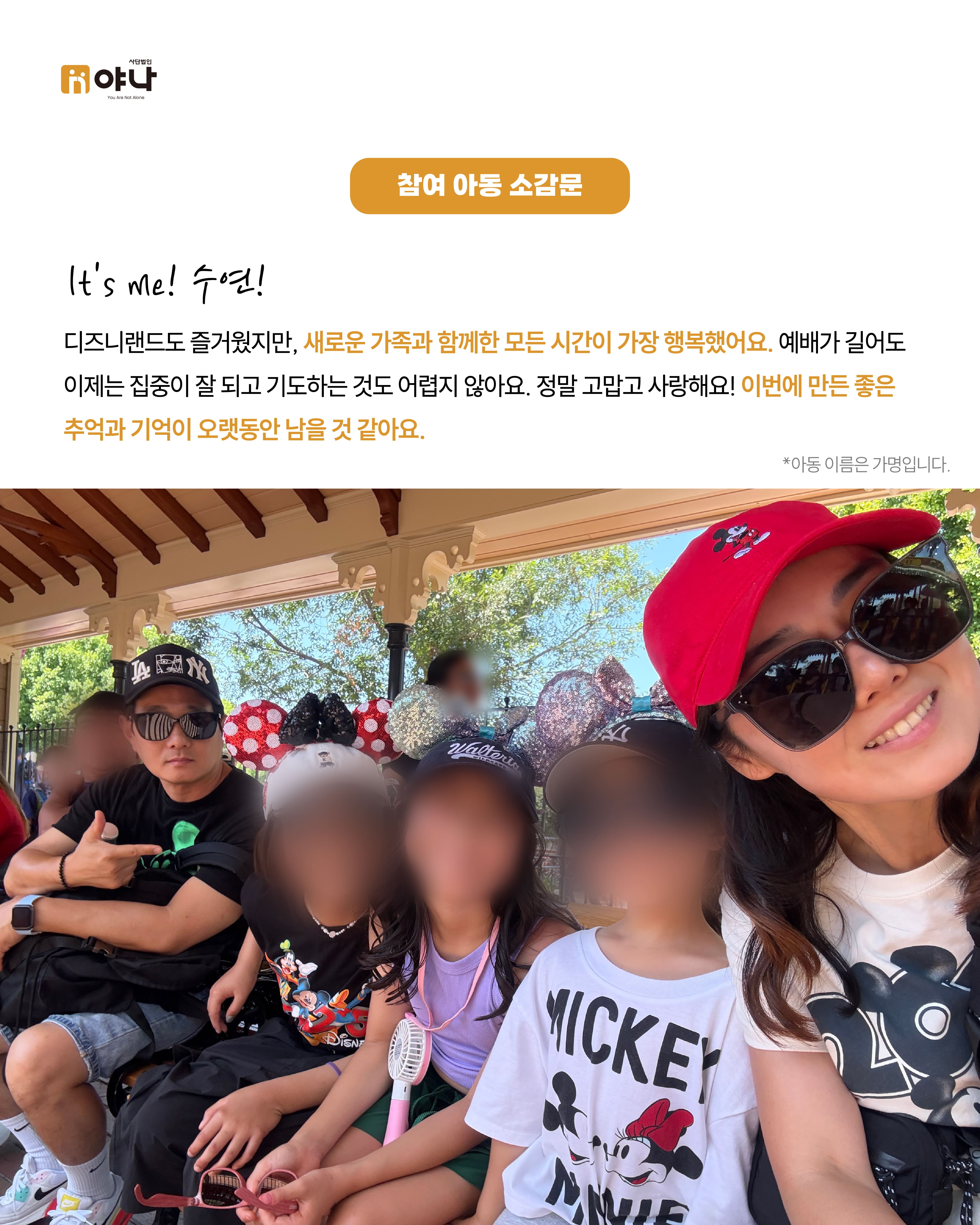 야나의 [Let's be Family 오늘부터 가족] 프로그램은 여름 미국 교회의 VBS(Vacation Bible School) 기간에 한국의 보육원 아동이 미국을 직접 방문하여, 교회 내 홈스테이 가정과 1:1로 연결되어 온전한 가정생활을 직접 경험할 수 있도록 합니다.