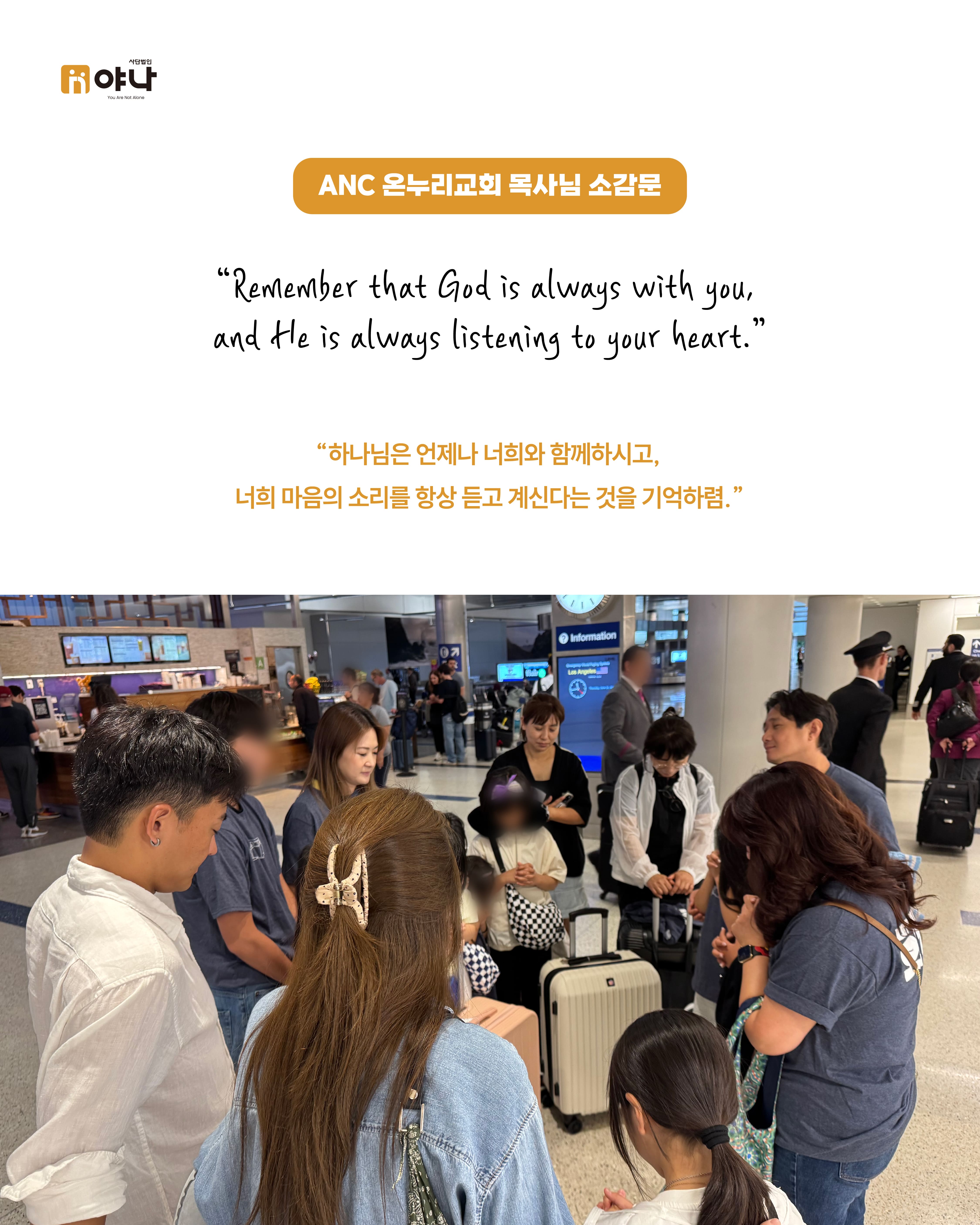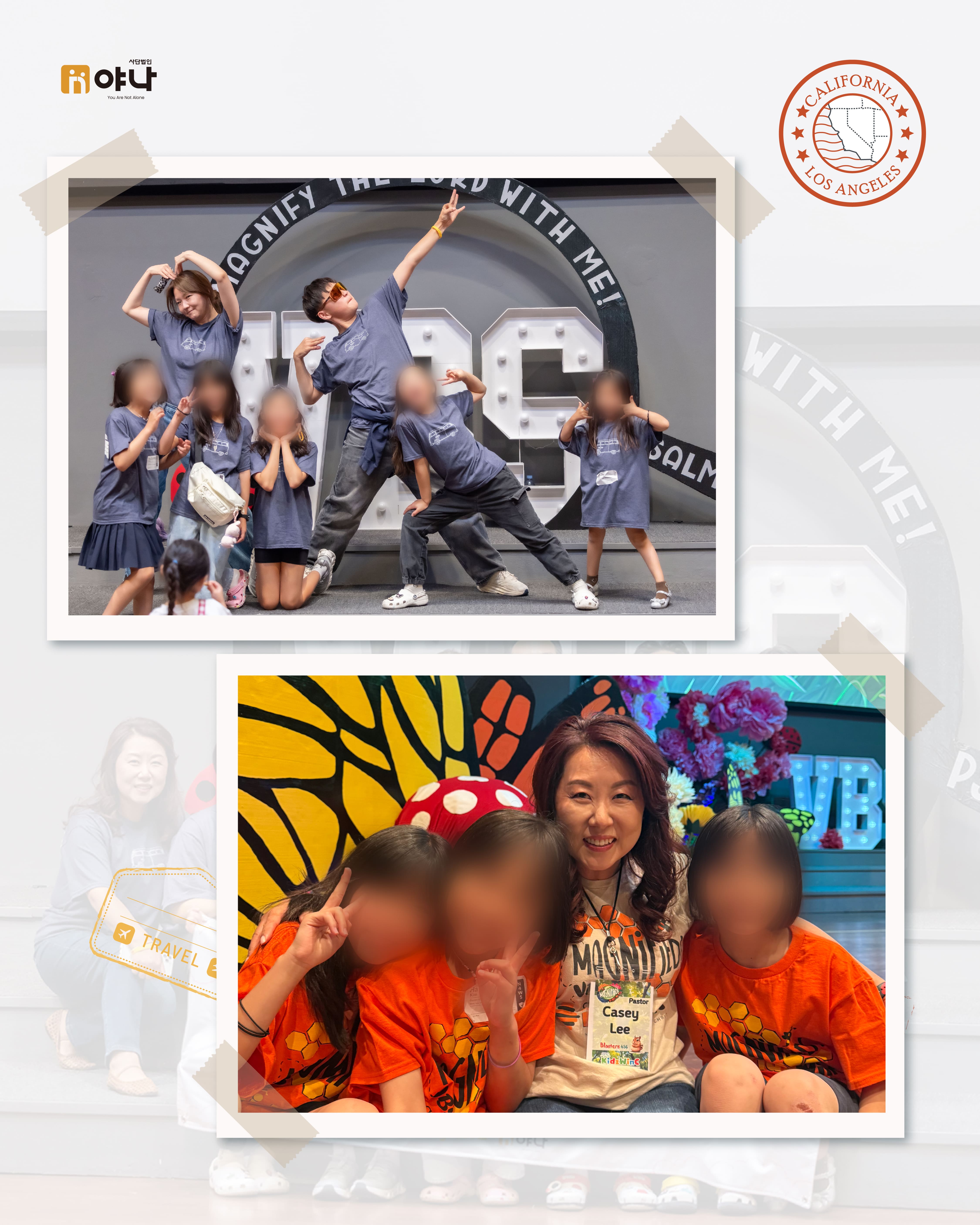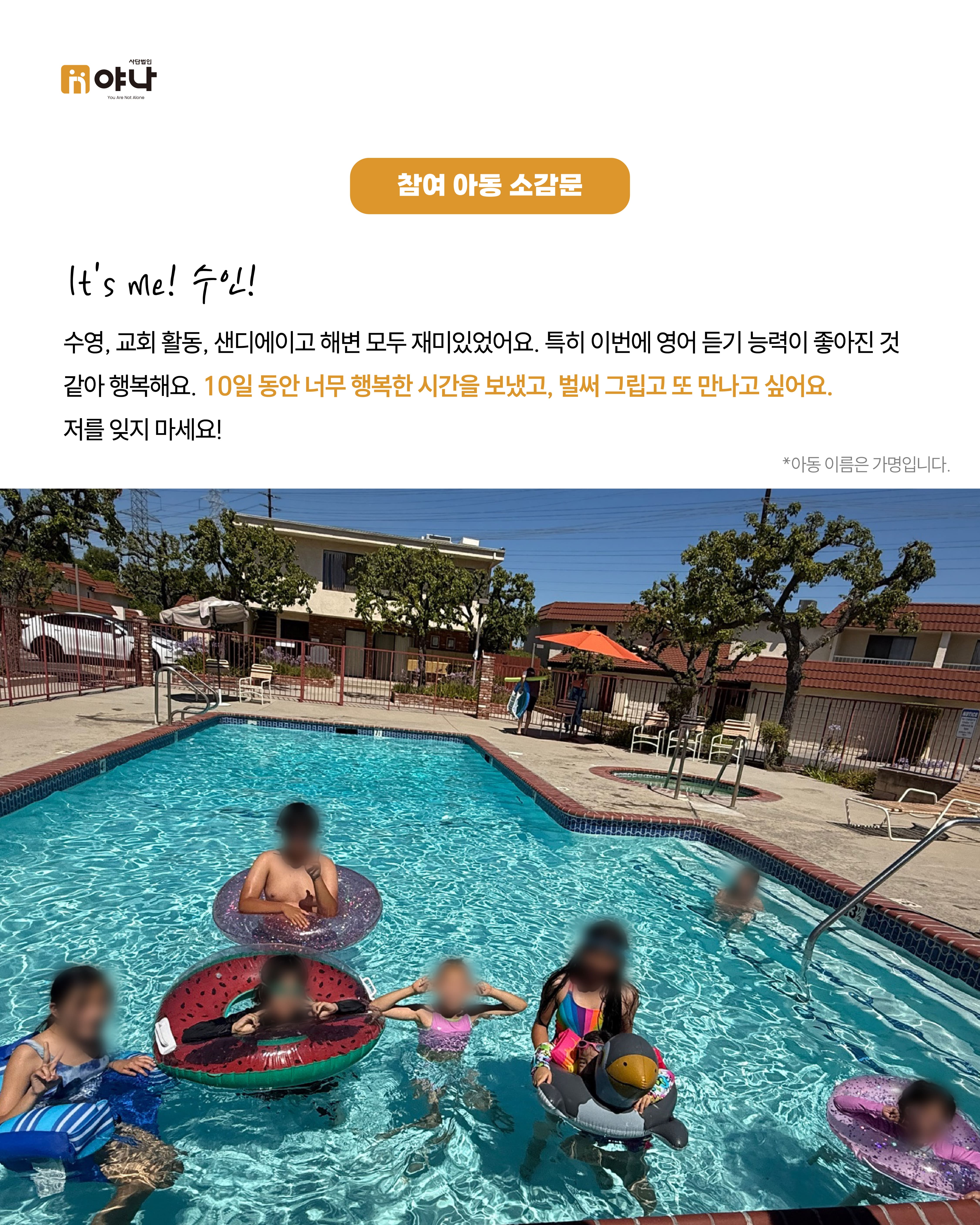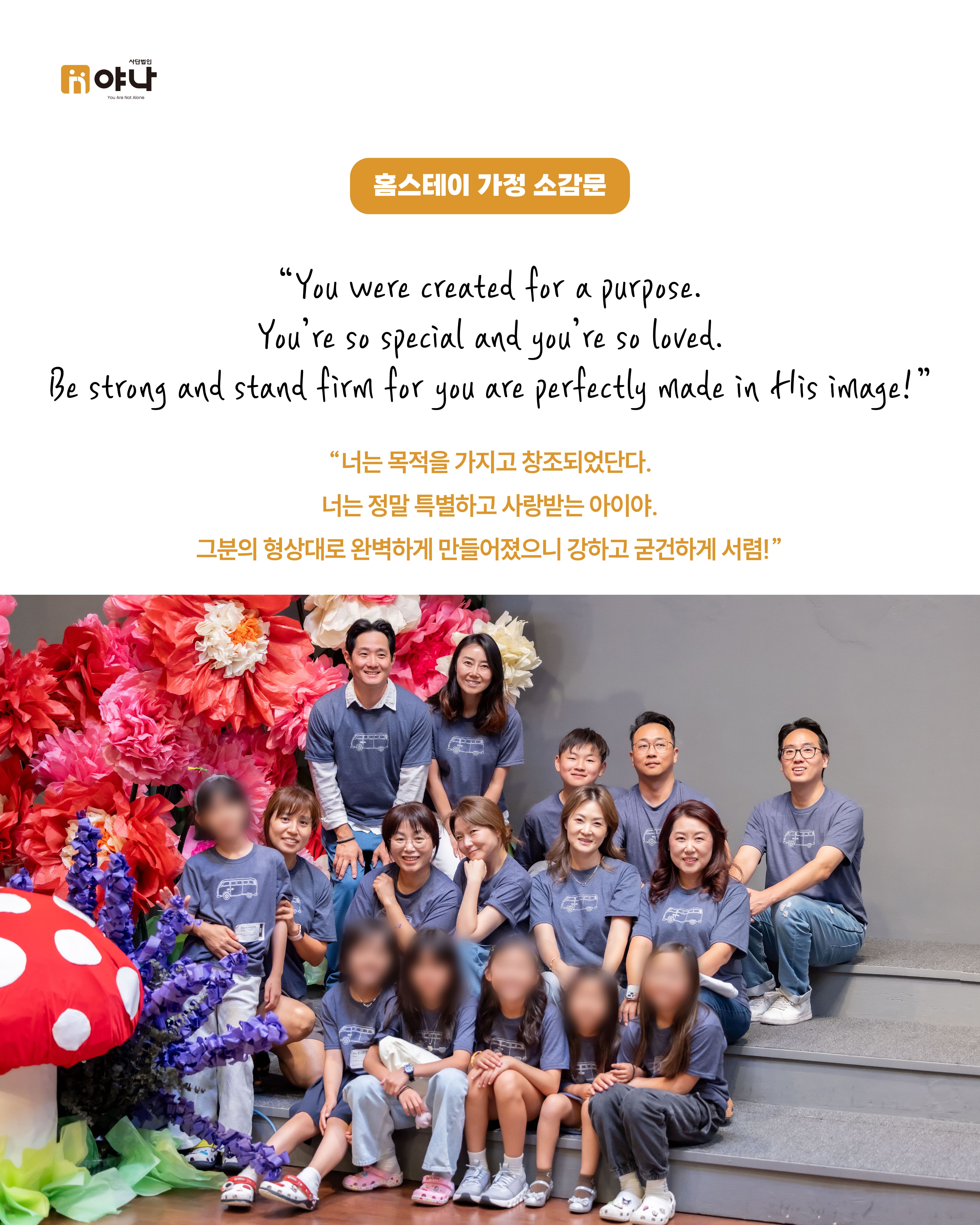 야나의 [Let's be Family 오늘부터 가족] 프로그램은 여름 미국 교회의 VBS(Vacation Bible School) 기간에 한국의 보육원 아동이 미국을 직접 방문하여, 교회 내 홈스테이 가정과 1:1로 연결되어 온전한 가정생활을 직접 경험할 수 있도록 합니다.