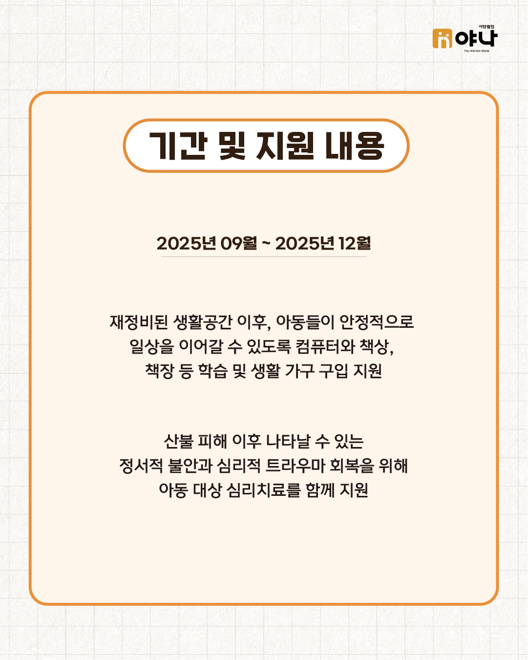 이에 야나는 2025년 9월부터 12월까지 산불 피해 위탁가정을 대상으로 긴급지원을 진행하였습니다.