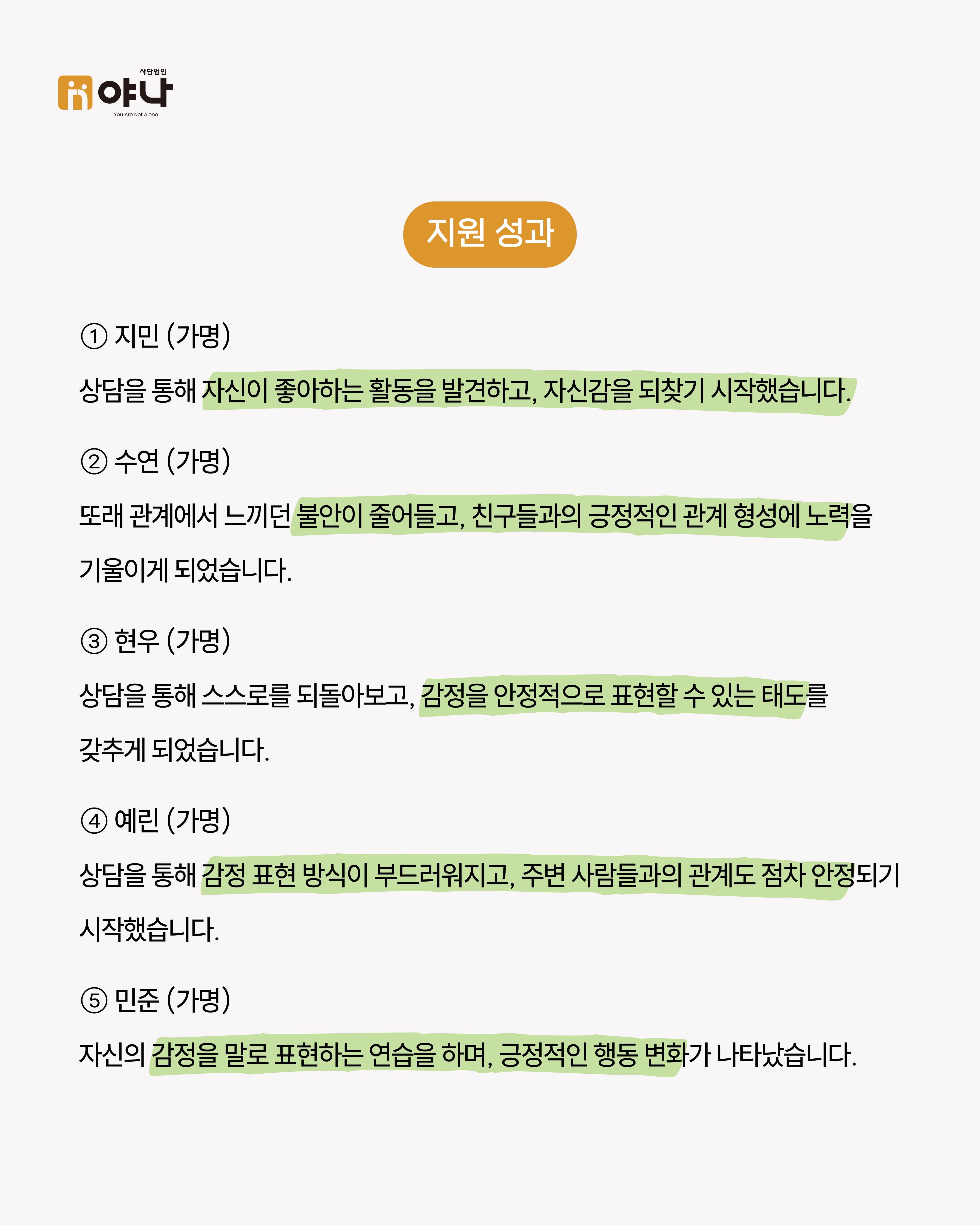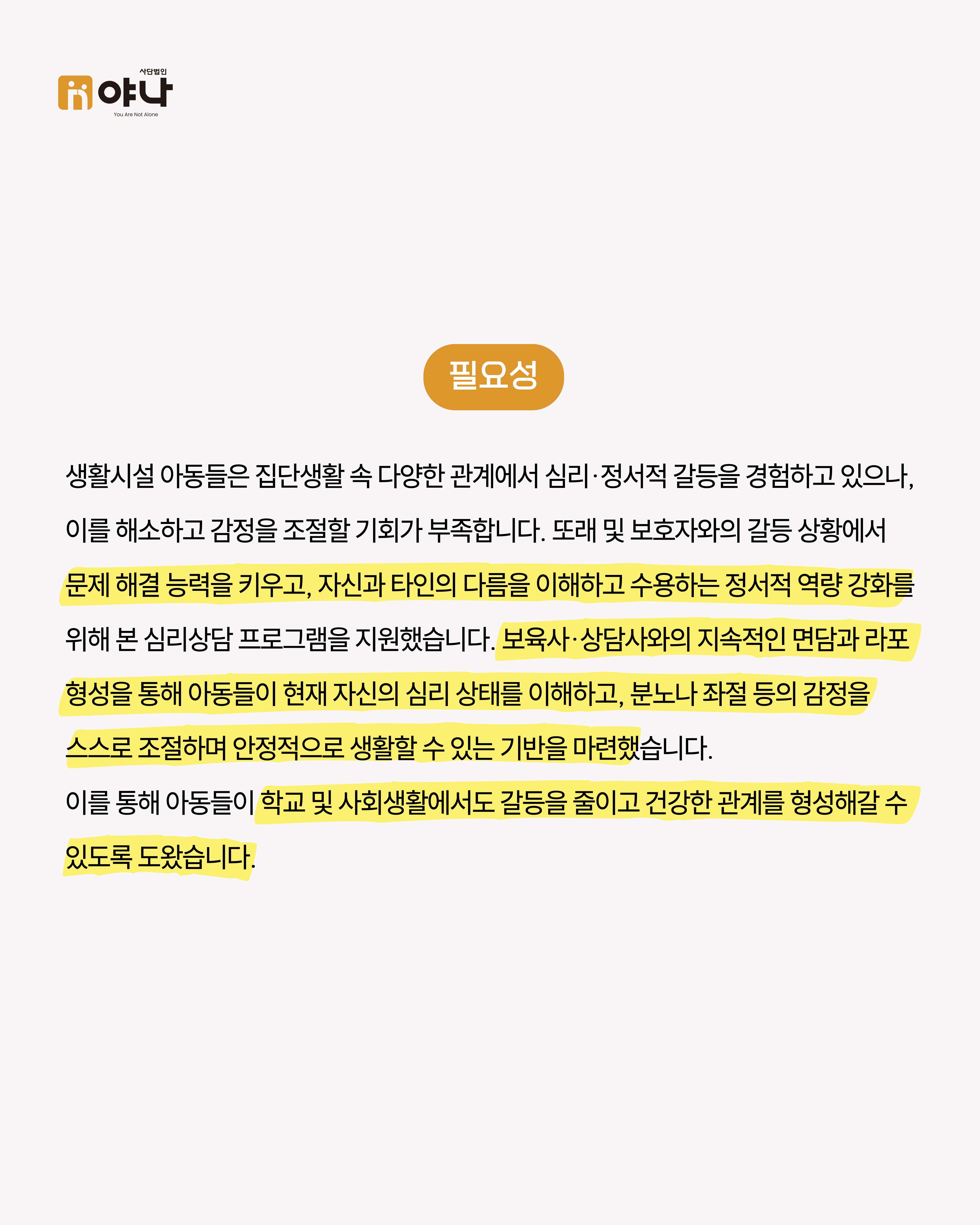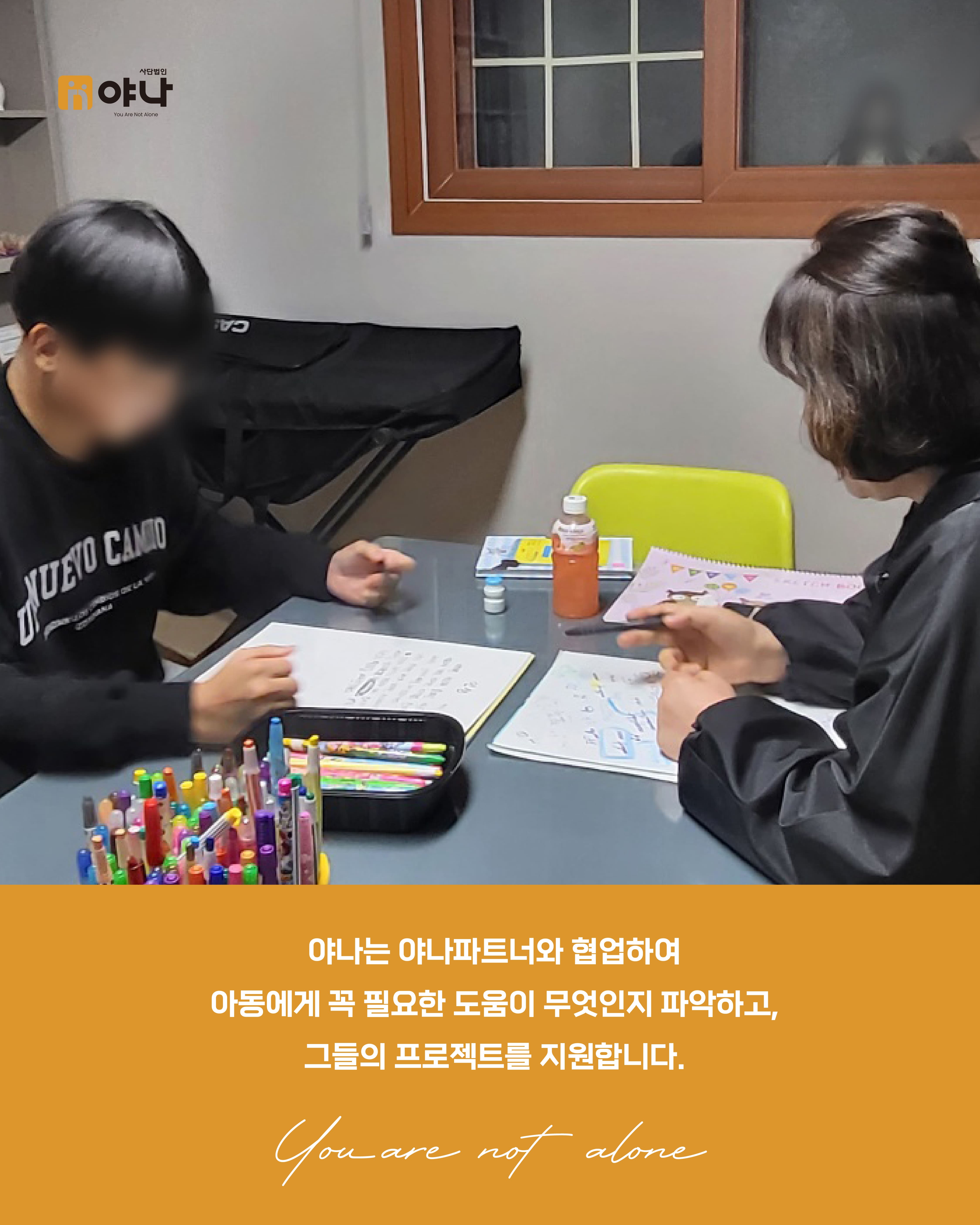 야나는 파트너 프로젝트의 일환으로 동광원 아동들의 심리·정서적 안정을 위한 아동 심리상담 프로그램을 지원했습니다.