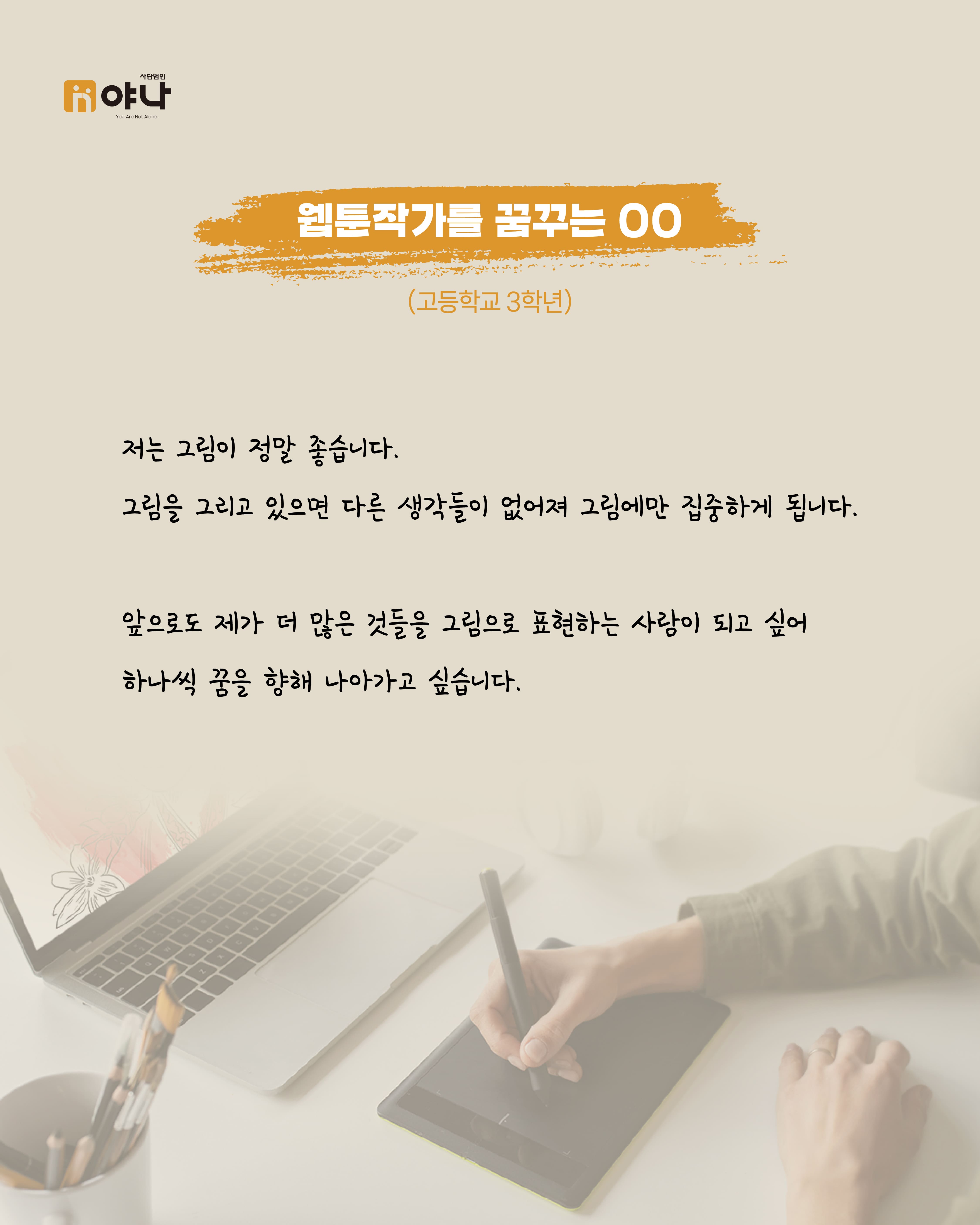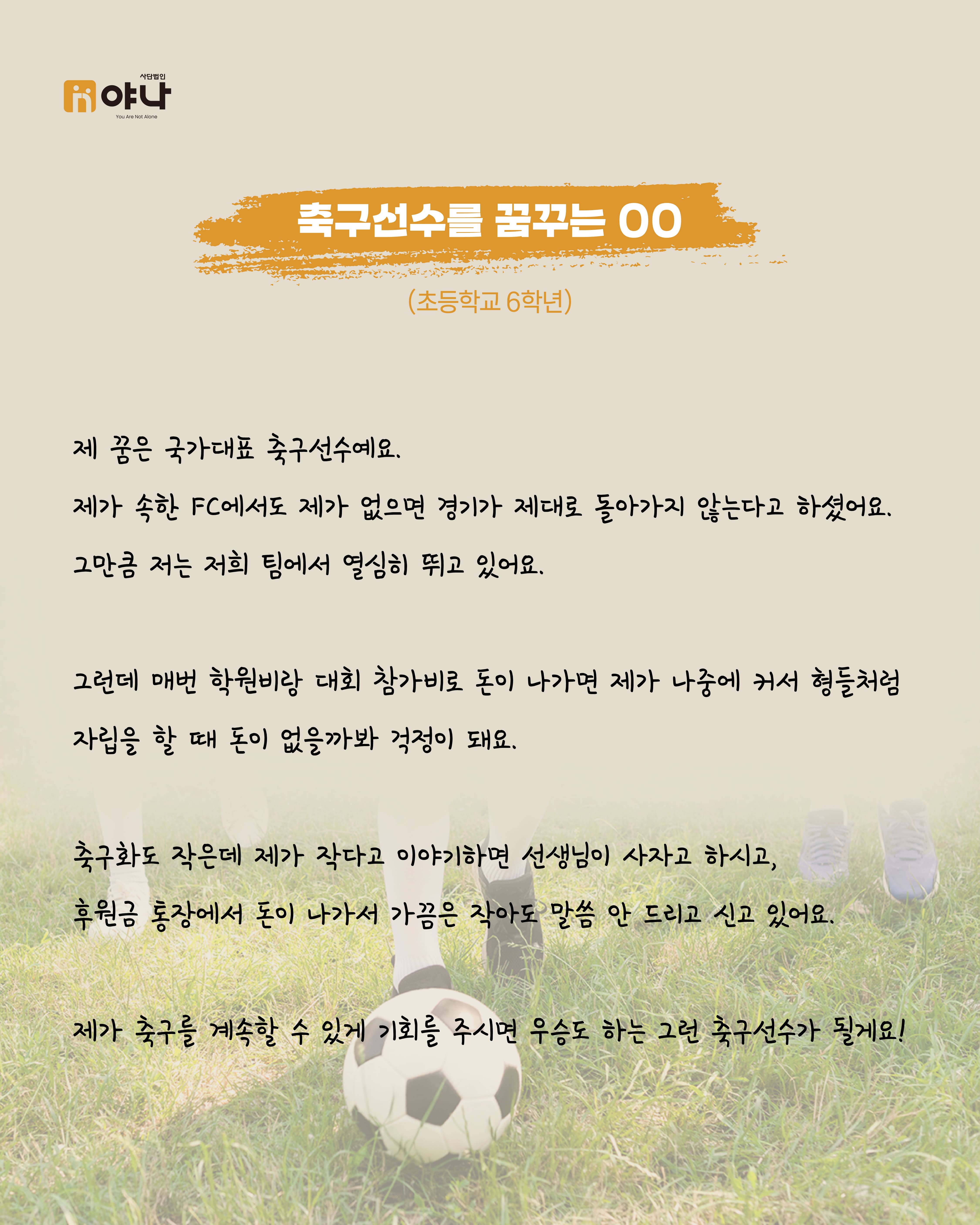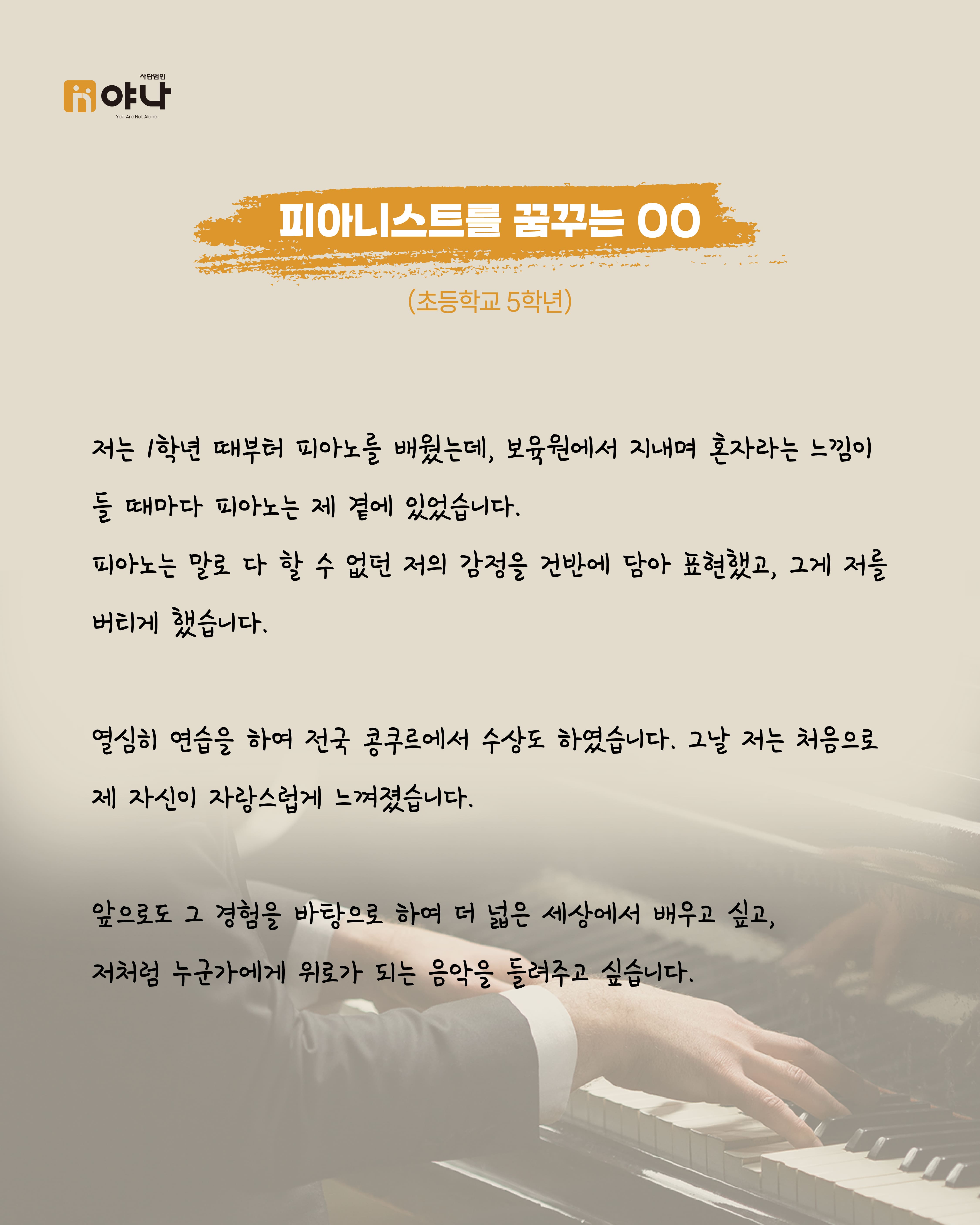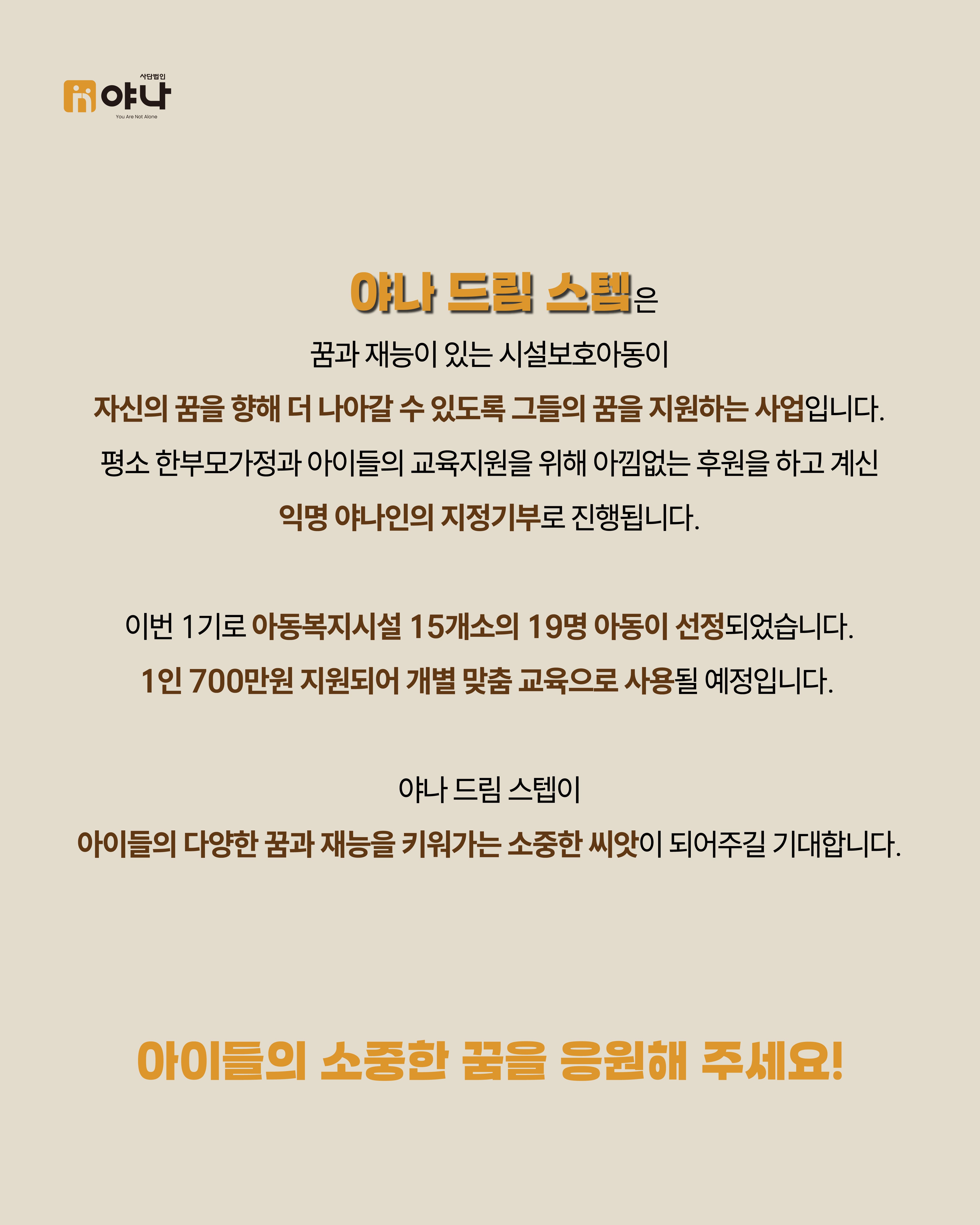 야나 드림 스텝은 꿈과 재능이 있는 시설보호아동이 자신의 꿈을 향해 더 나아갈 수 있도록 그들의 꿈을 지원하는 사업입니다.