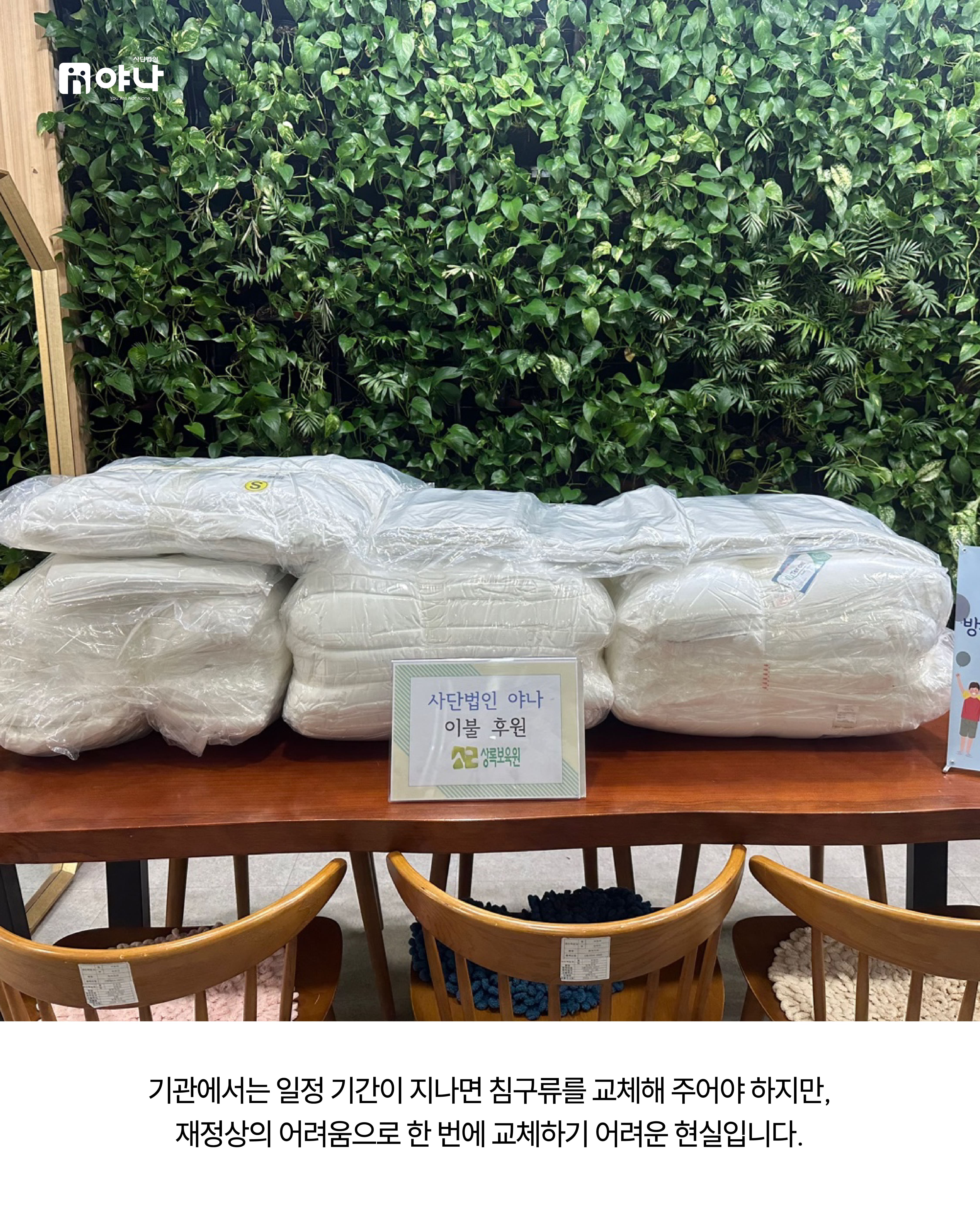 기관에서는 일정 기간이 지나면 침구류를 교체해 주어야 하지만 재정상의 어려움으로 한 번에 교체하기 어려운 현실입니다.