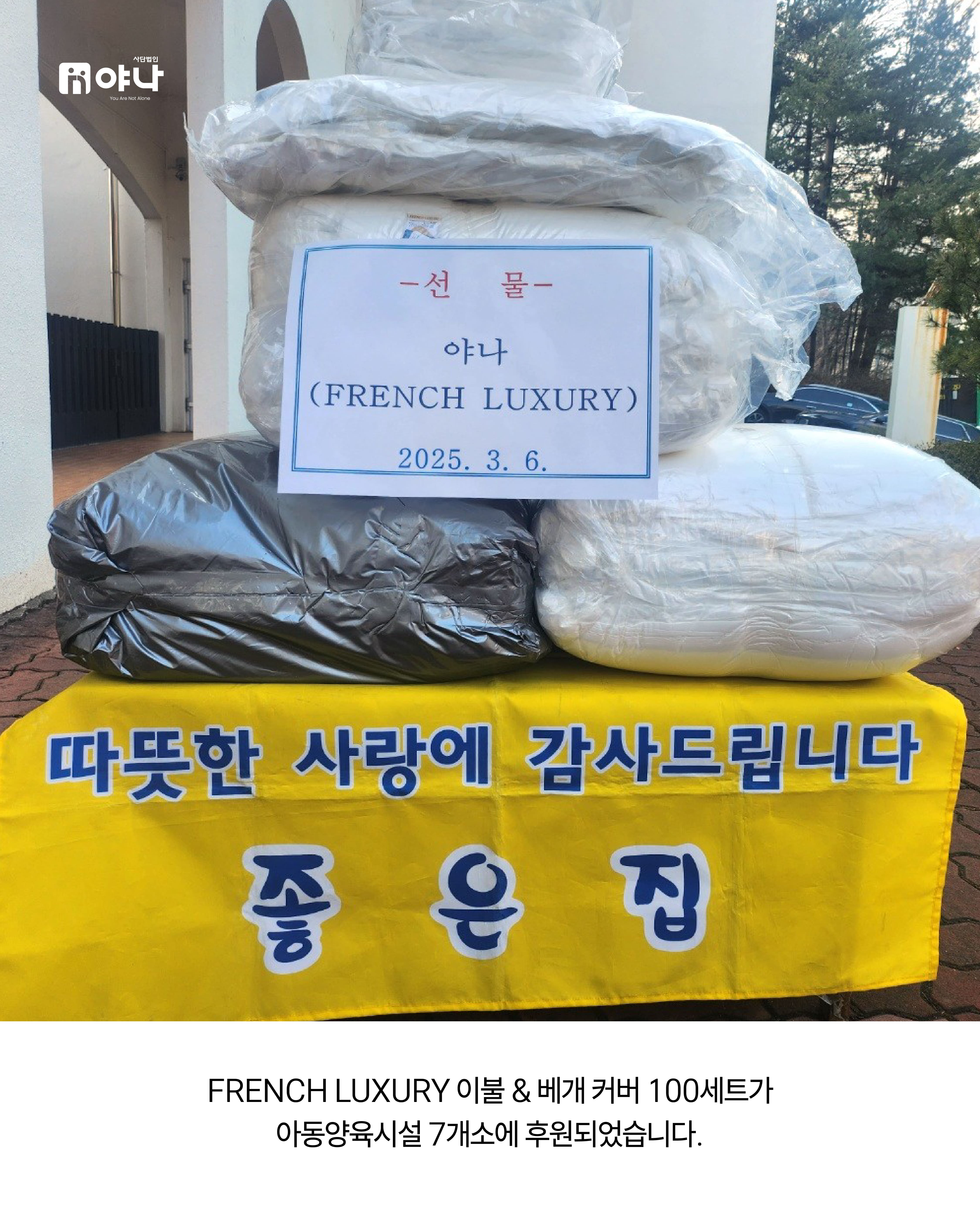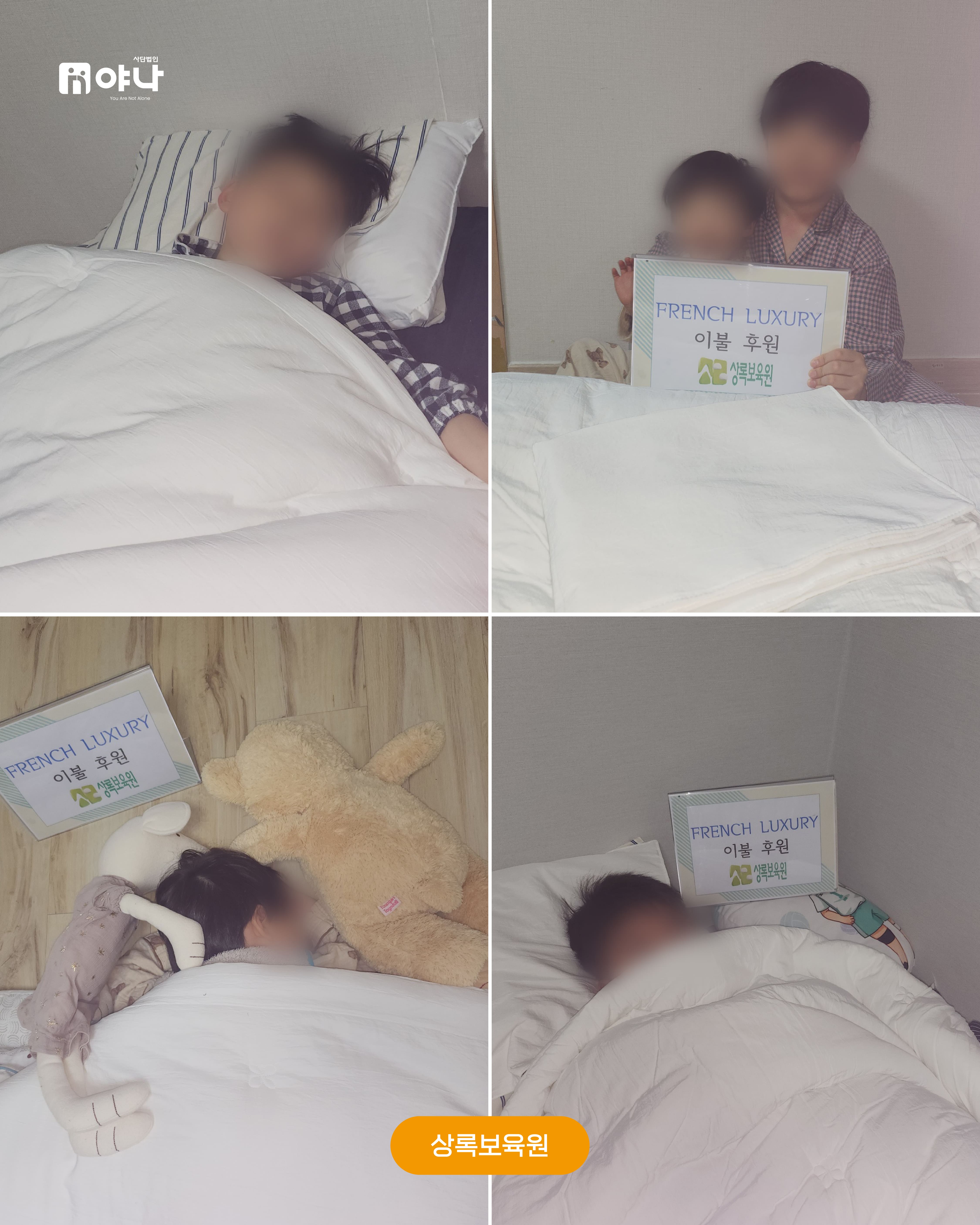 FRENCH LUXURY 이불 & 베개 커버 100세트가 아동양육시설 7개소에 후원되었습니다.