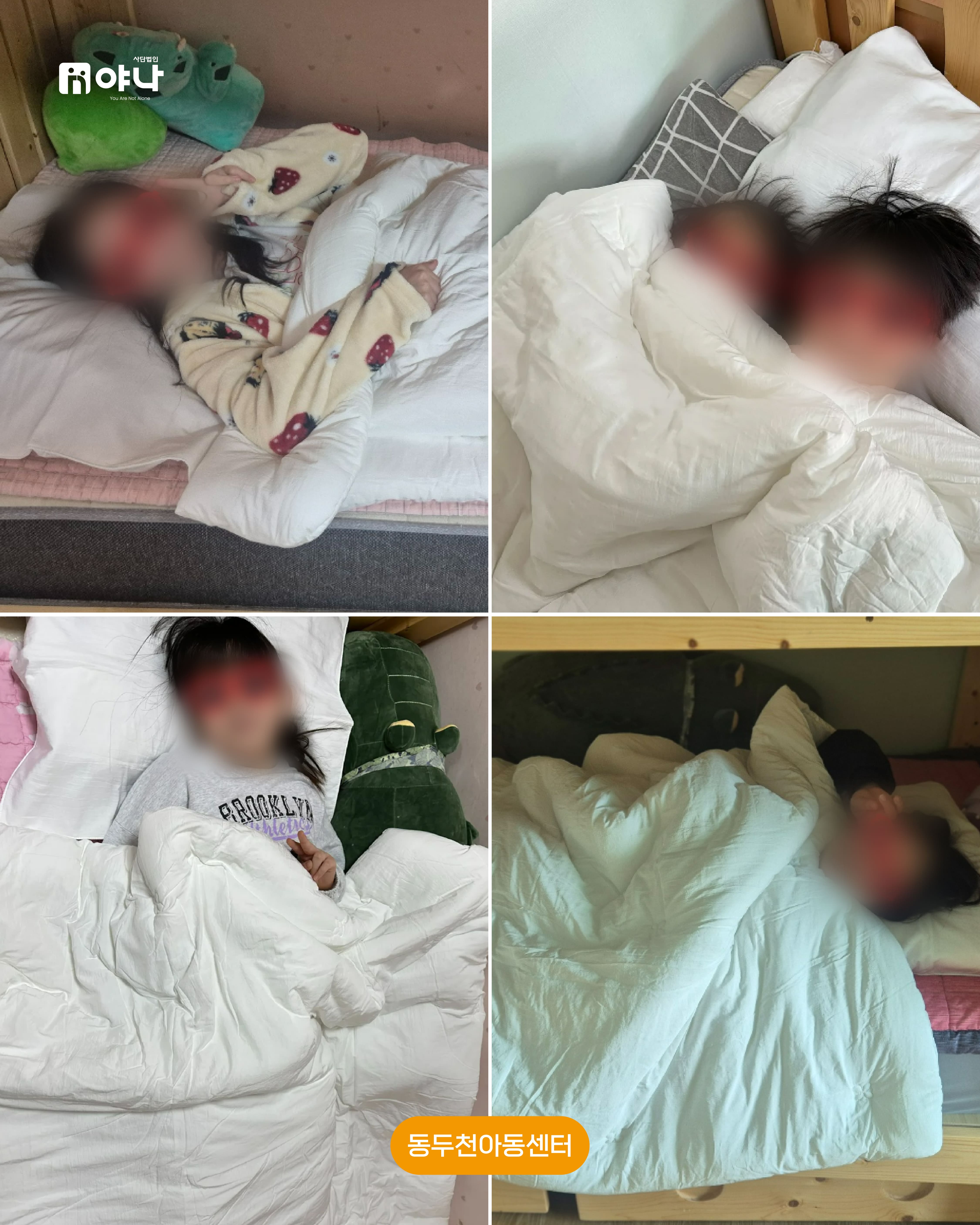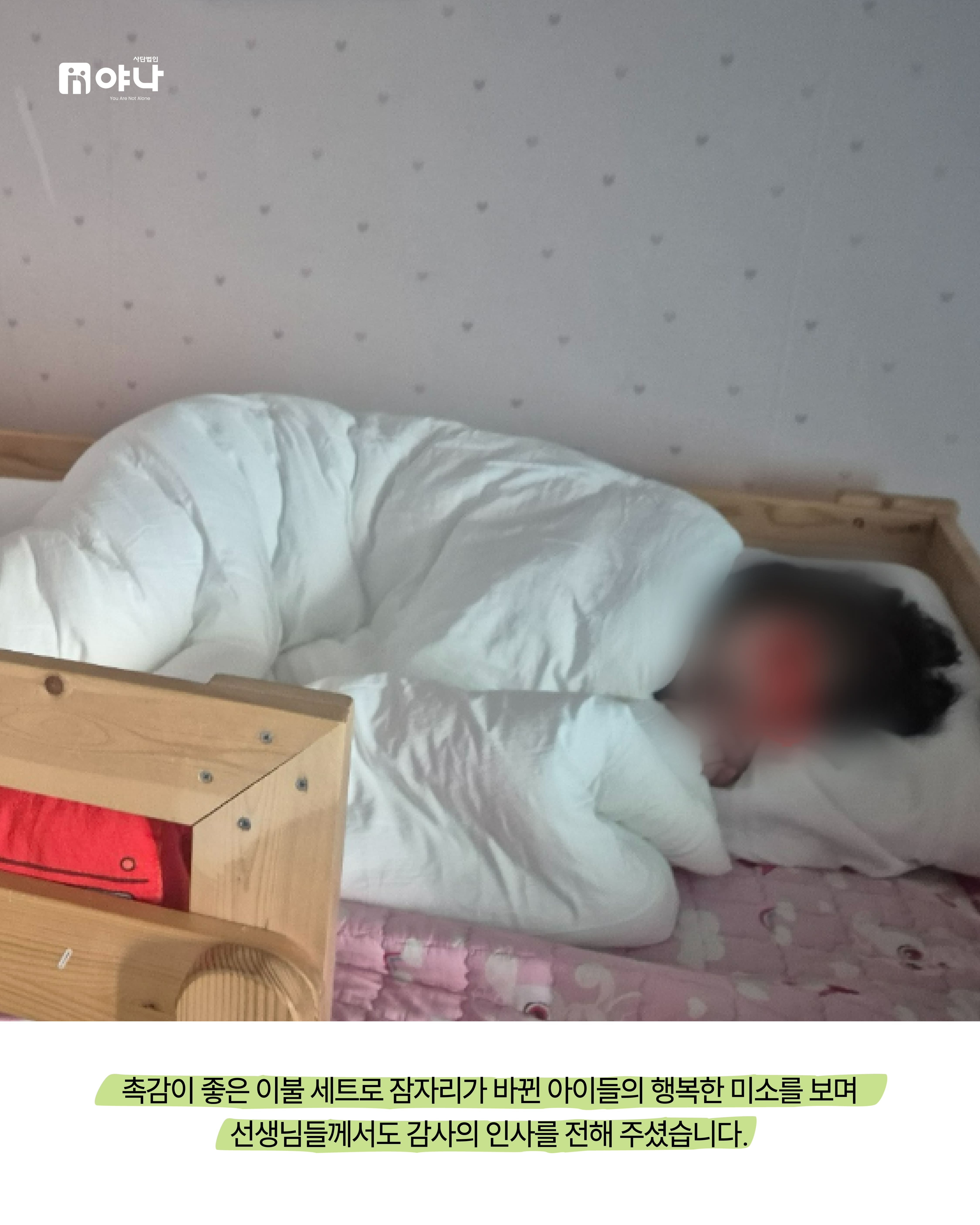 촉감이 좋은 이불 세트로 잠자리가 바뀐 아이들의 행복한 미소를 보며 선생님들께서도 감사의 인사를 전해 주셨습니다.