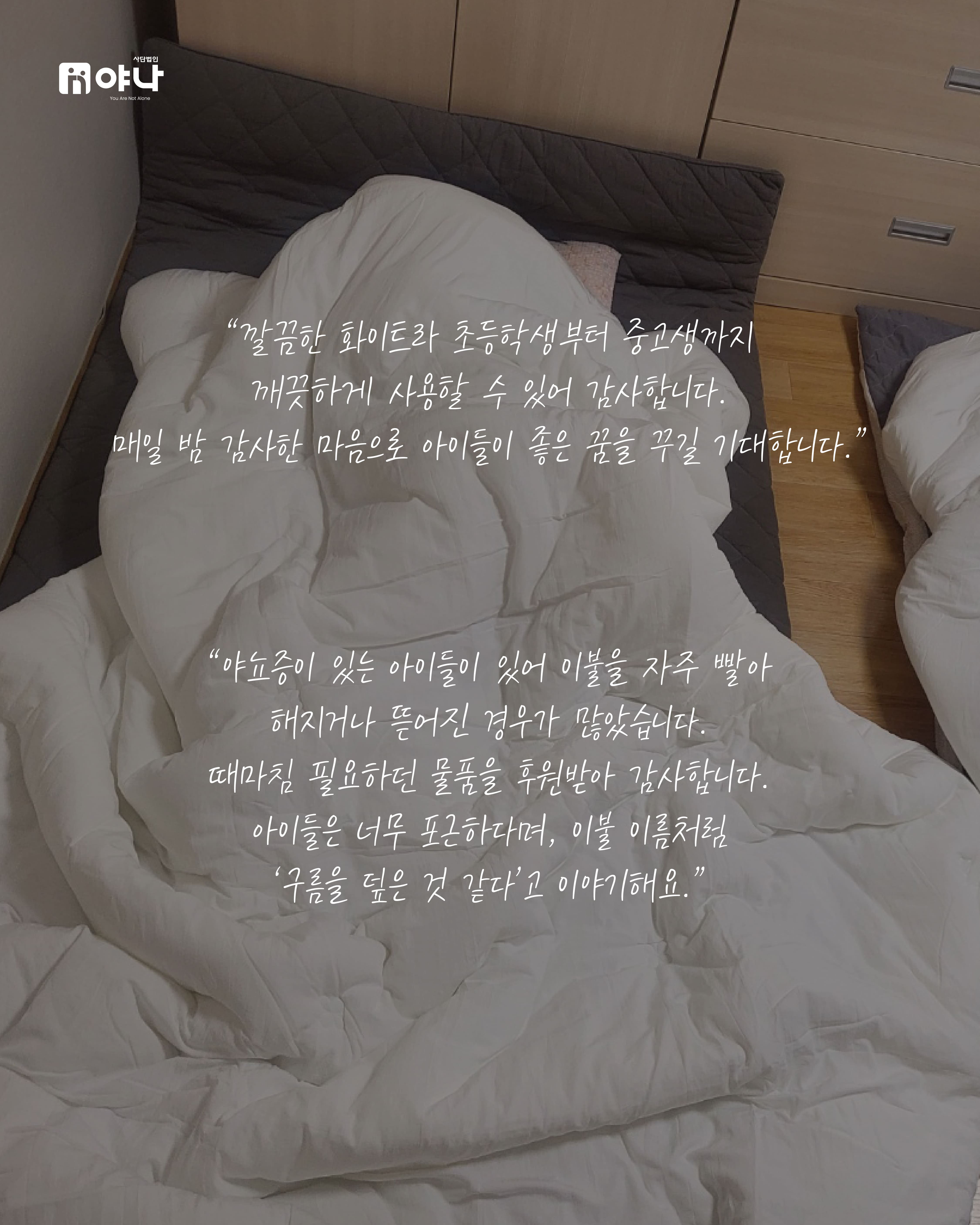 때마침 필요하던 물품을 후원받아 감사합니다. 아이들은 너무 포근하다며, 이불 이름처럼