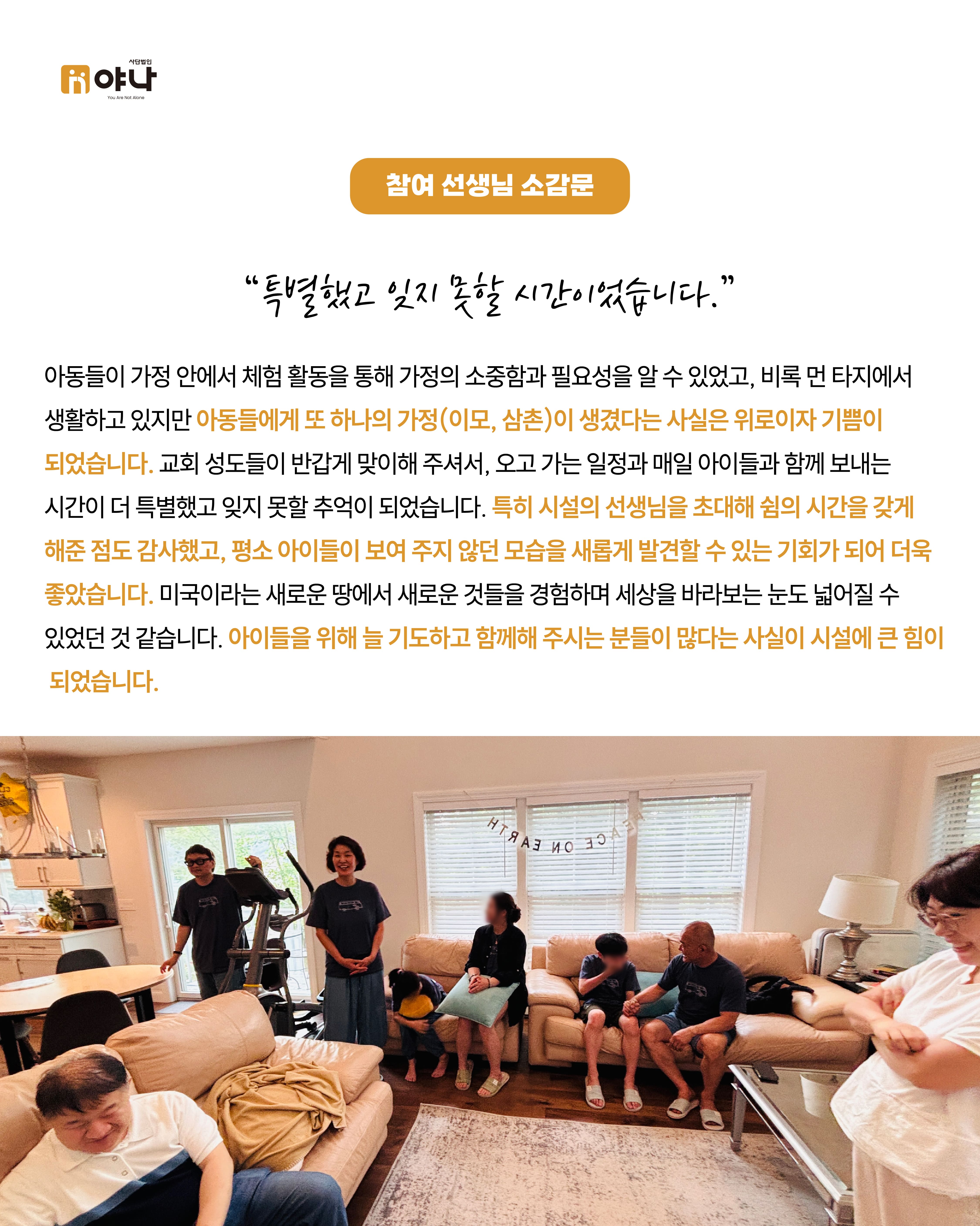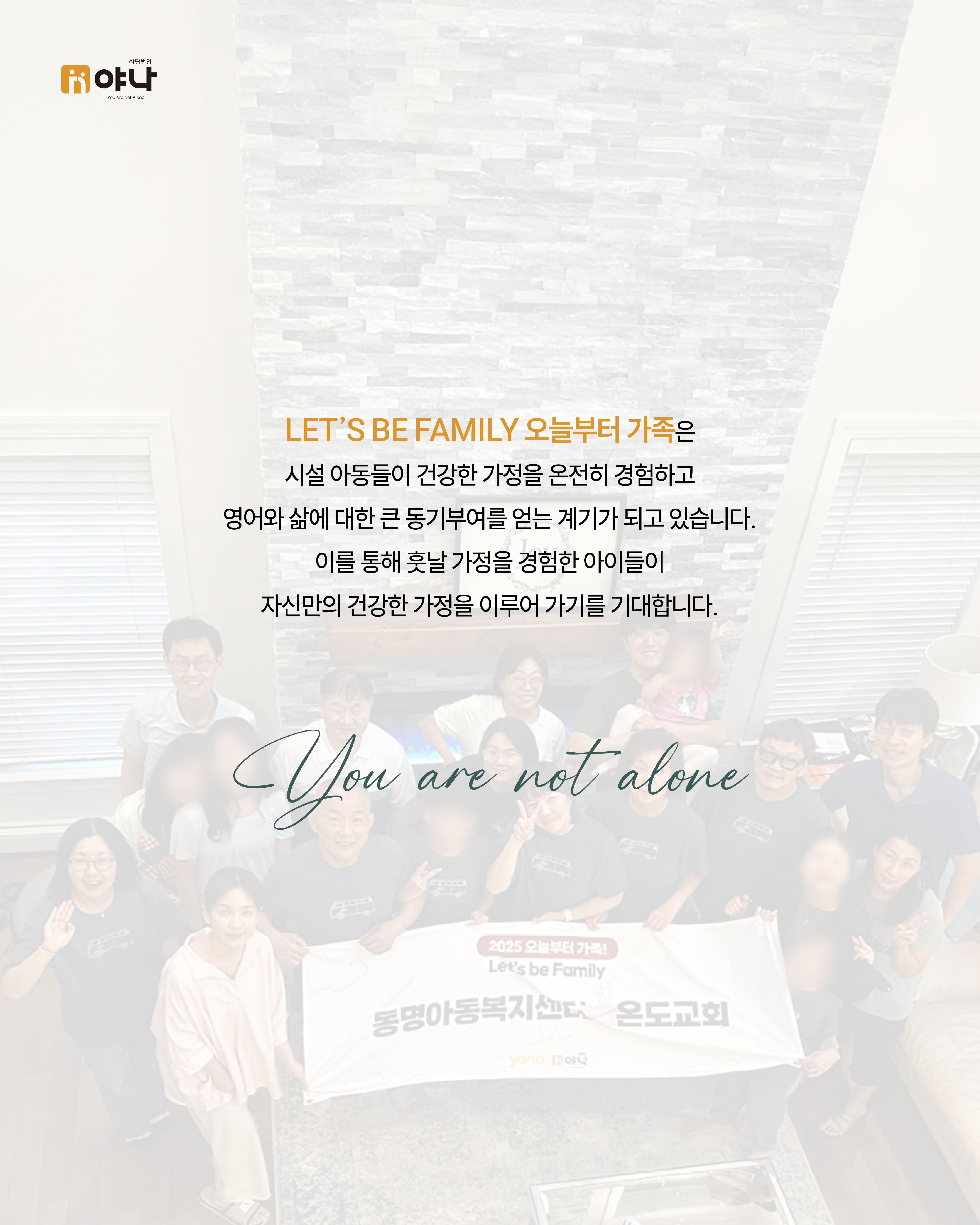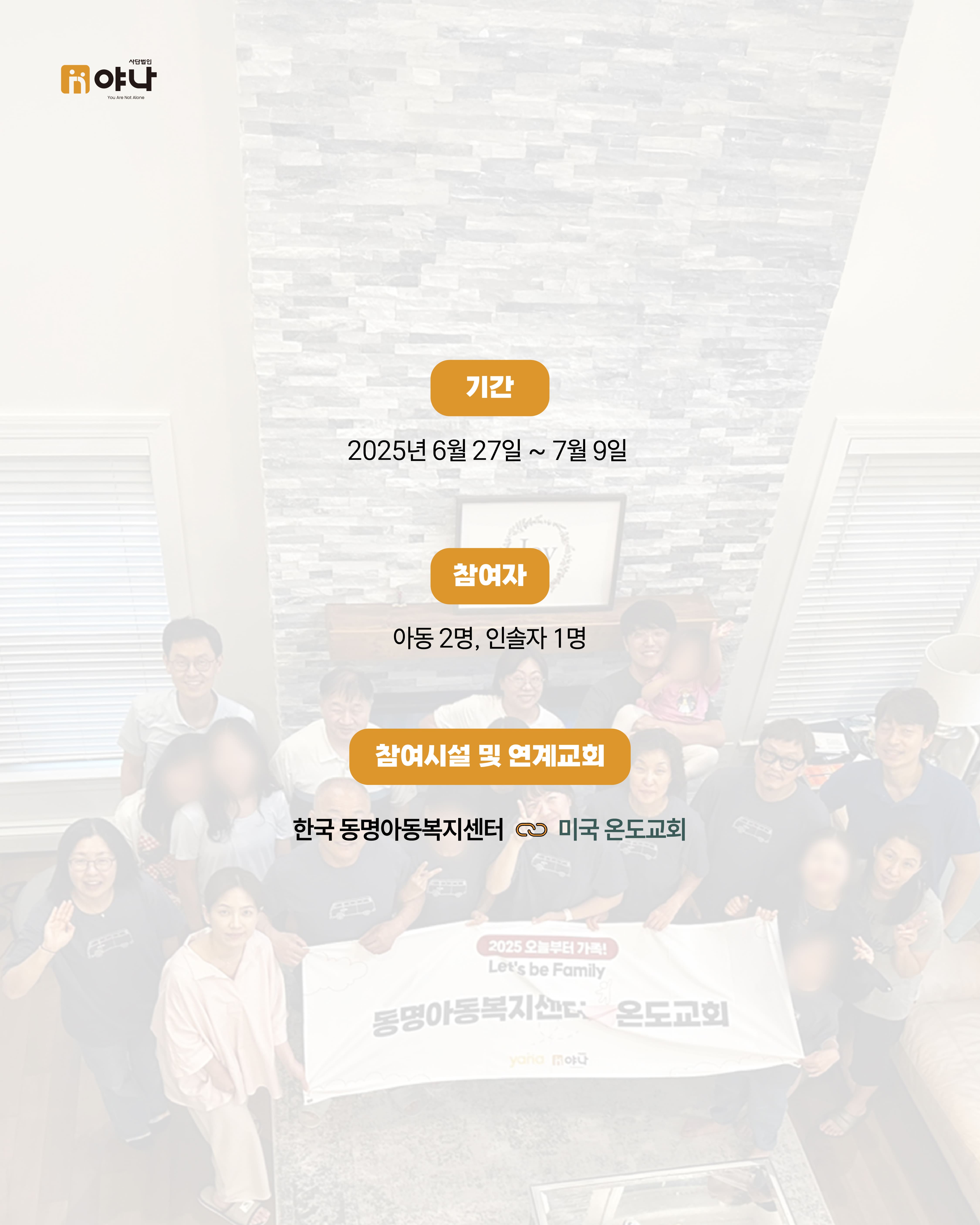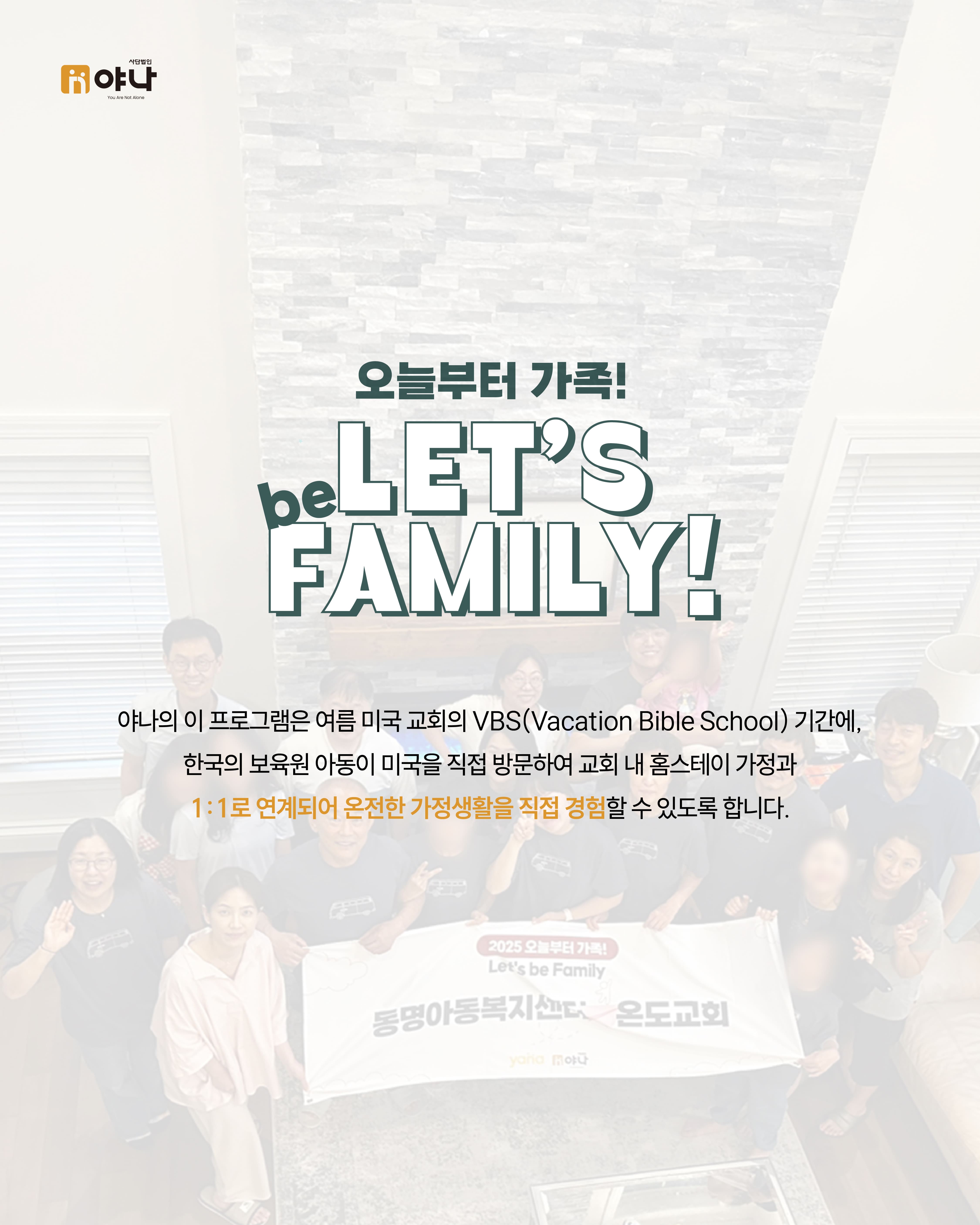 야나의 [Let's be Family 오늘부터 가족] 프로그램은 여름 미국 교회의 VBS(Vacation Bible School) 기간에 한국의 보육원 아동이 미국을 직접 방문하여, 교회 내 홈스테이 가정과 1:1로 연결되어 온전한 가정생활을 직접 경험할 수 있도록 합니다.