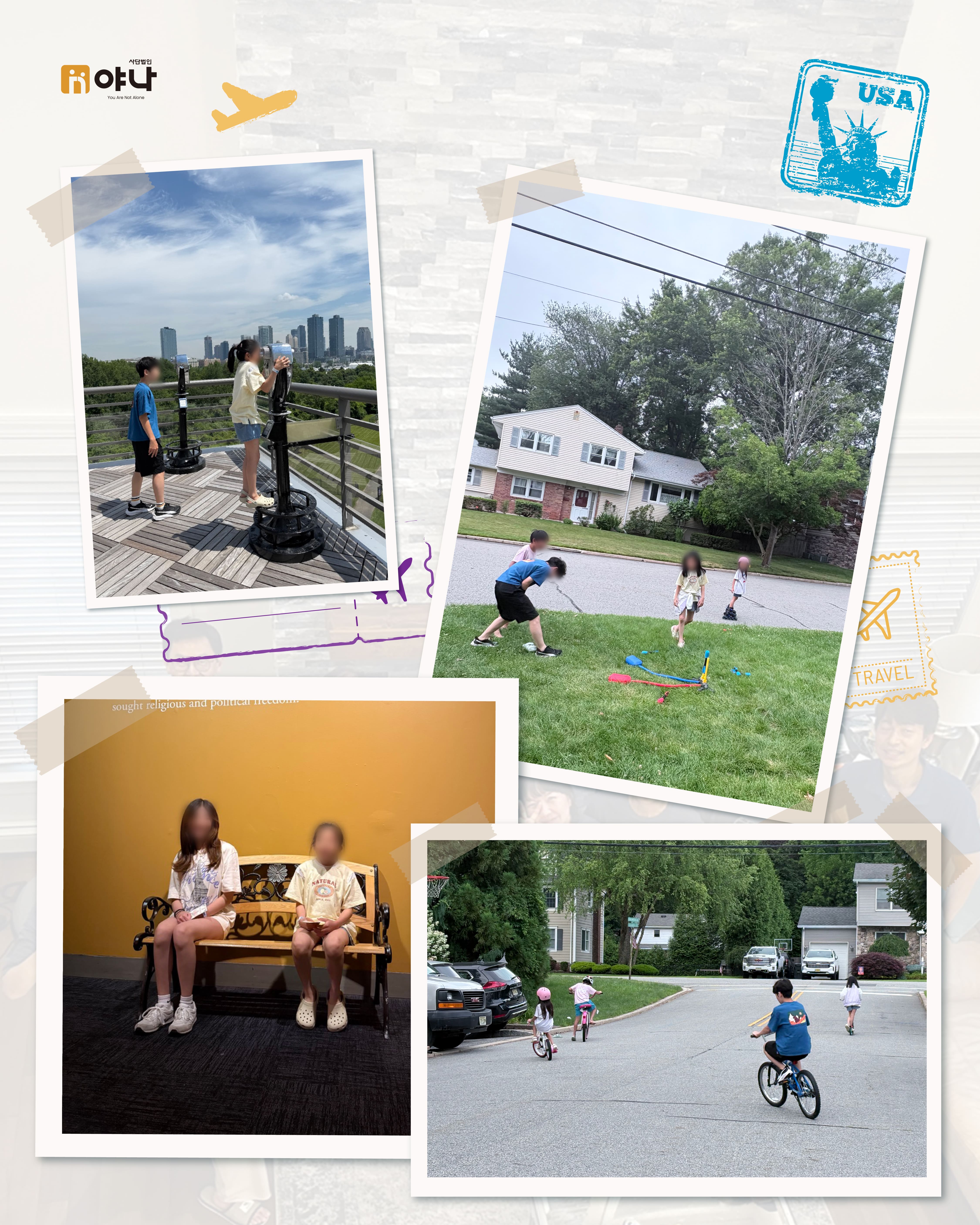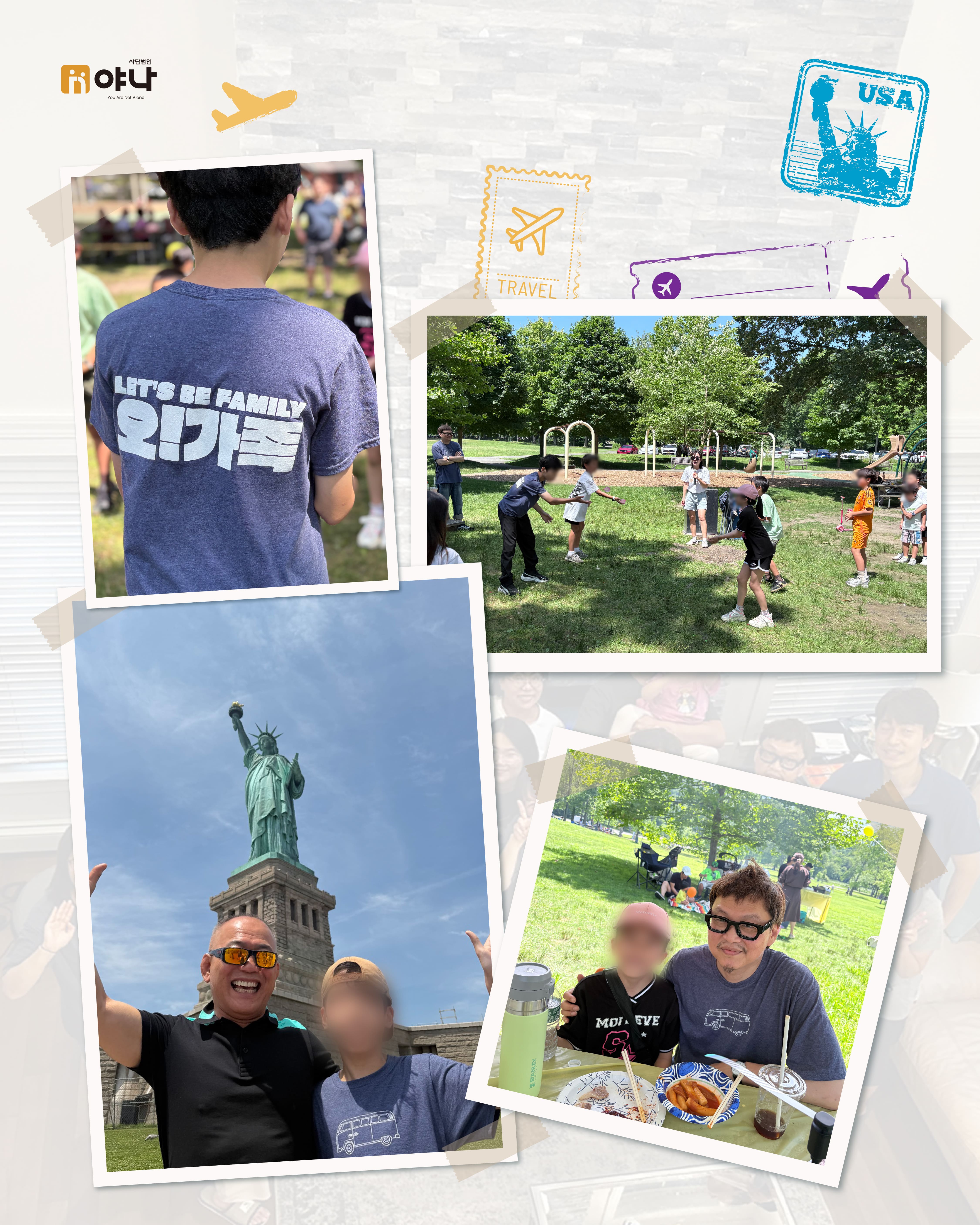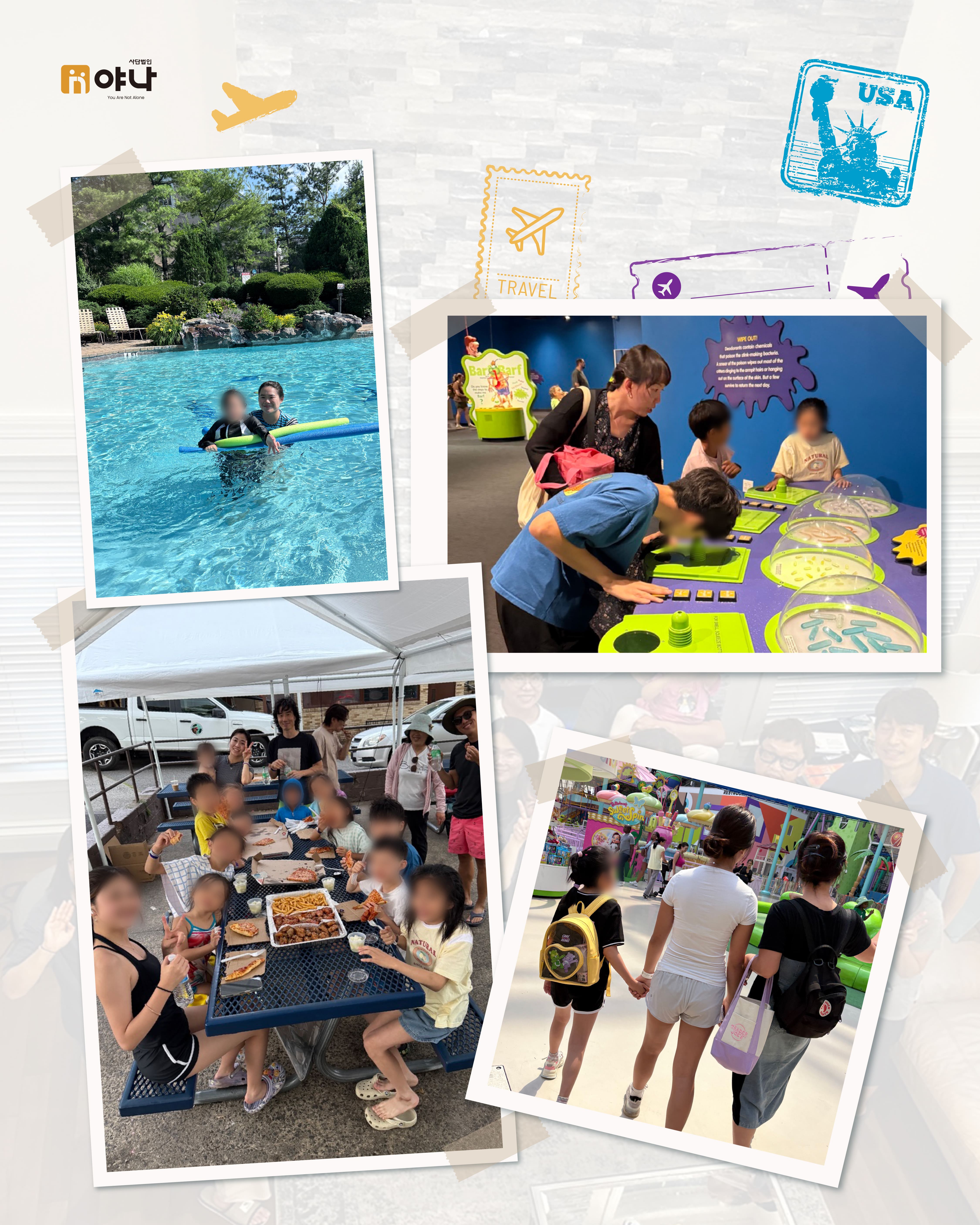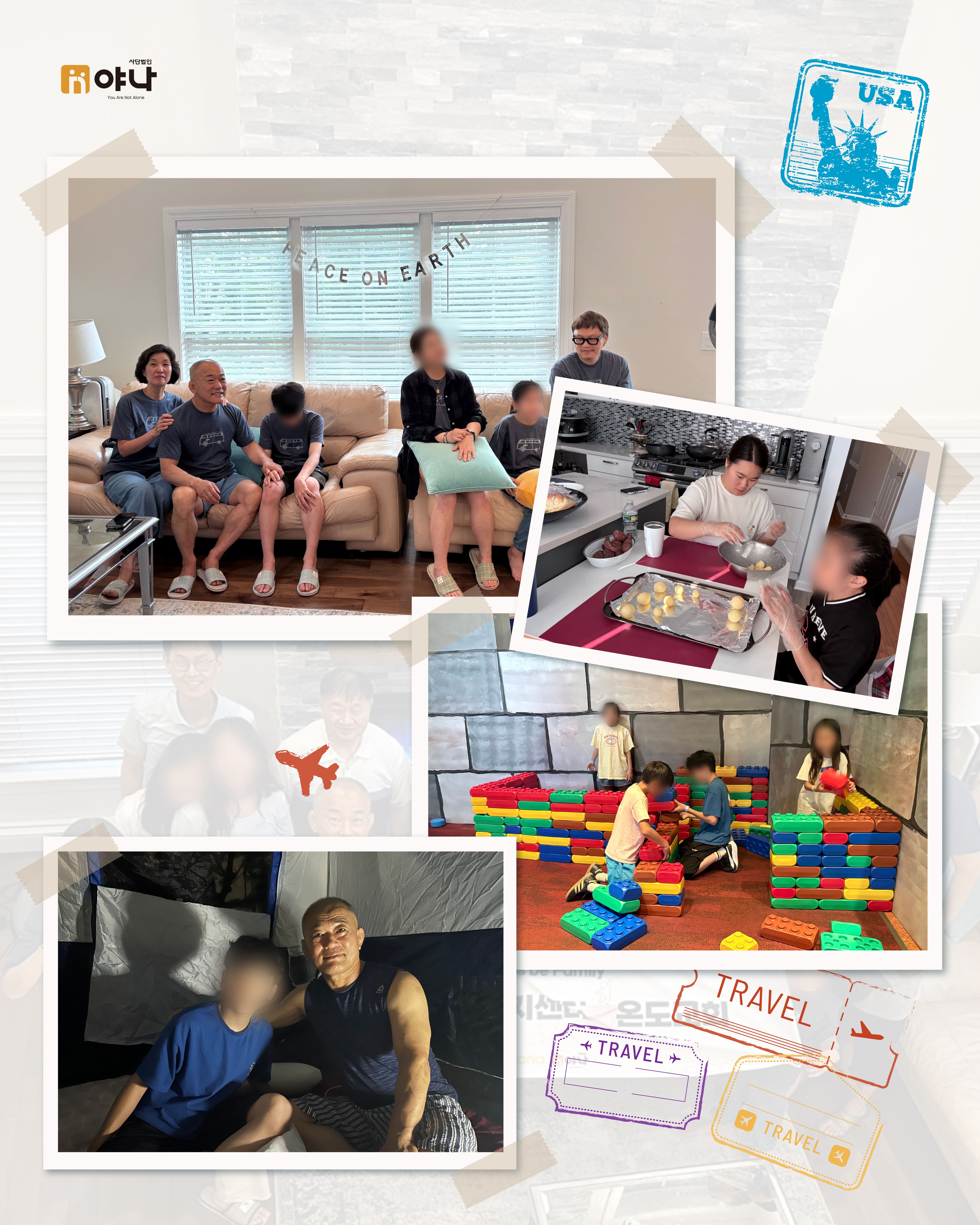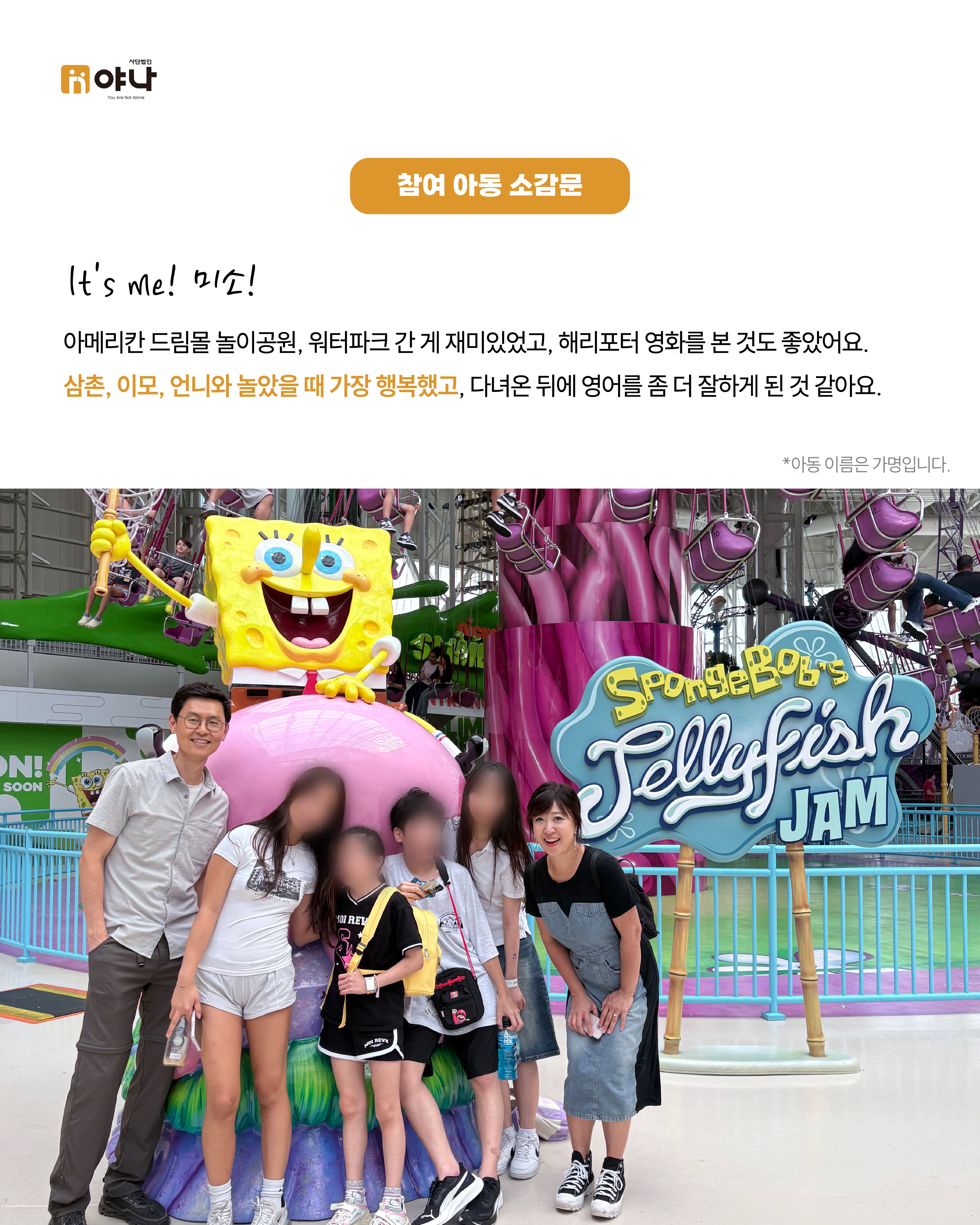 야나의 [Let's be Family 오늘부터 가족] 프로그램은 여름 미국 교회의 VBS(Vacation Bible School) 기간에 한국의 보육원 아동이 미국을 직접 방문하여, 교회 내 홈스테이 가정과 1:1로 연결되어 온전한 가정생활을 직접 경험할 수 있도록 합니다.