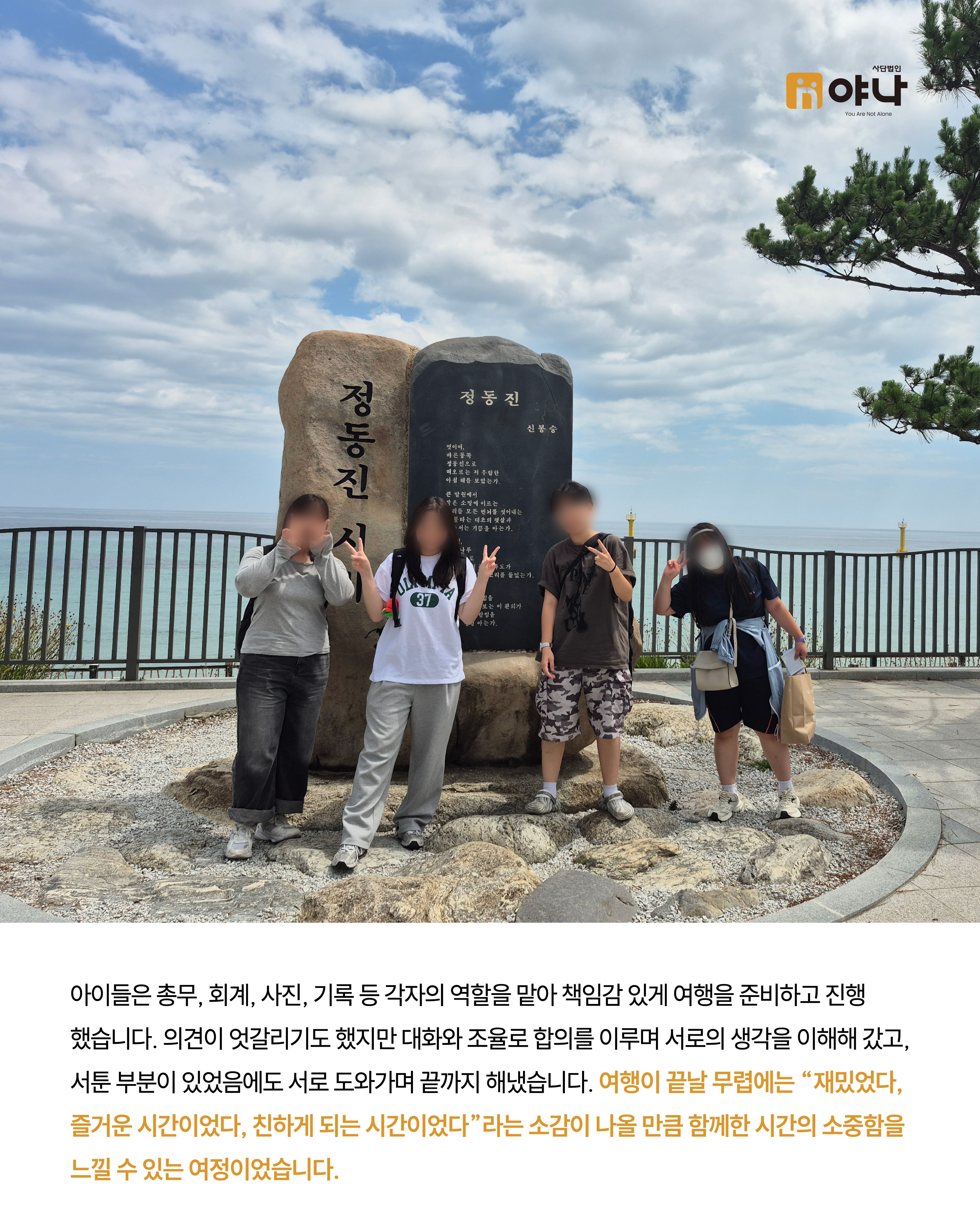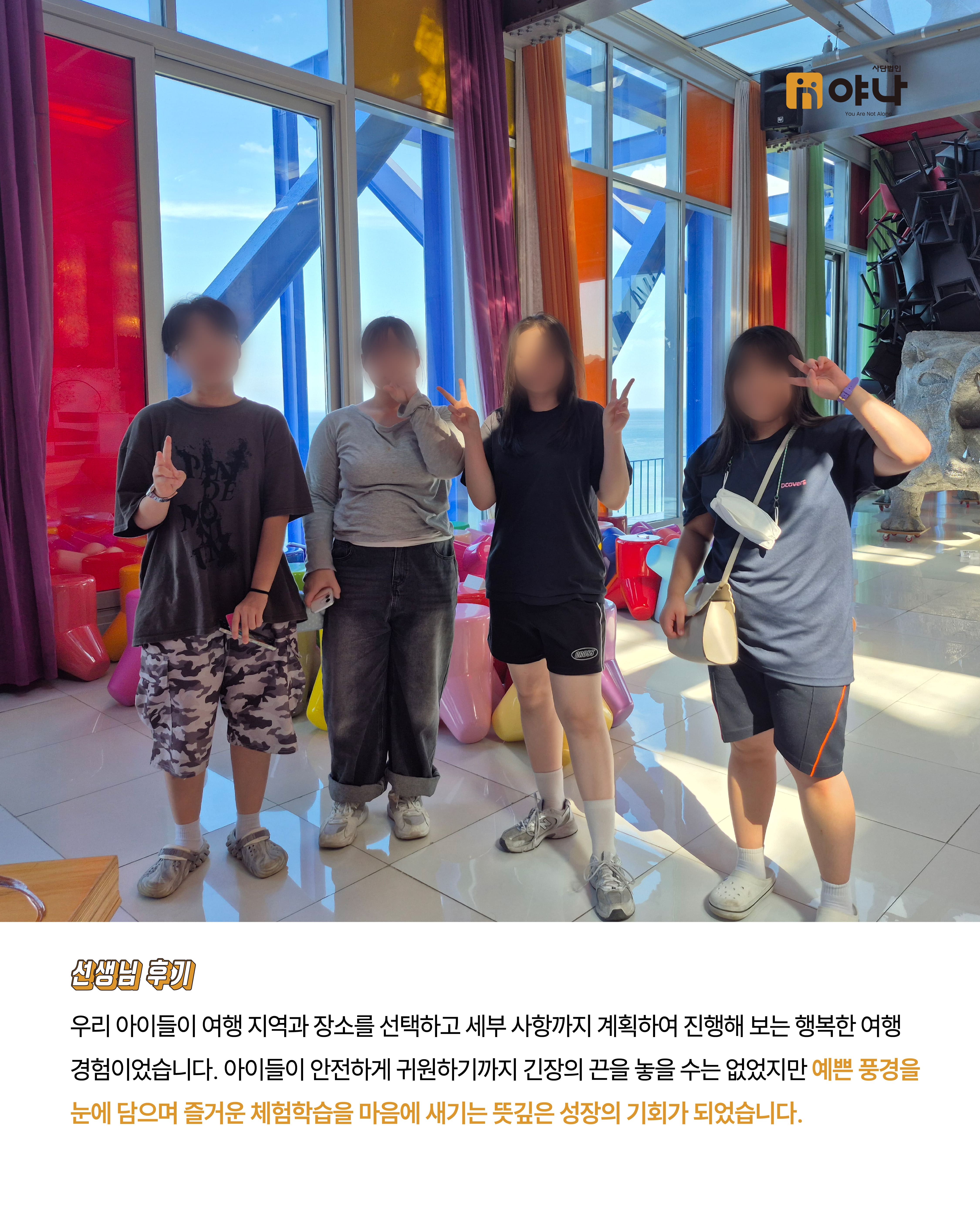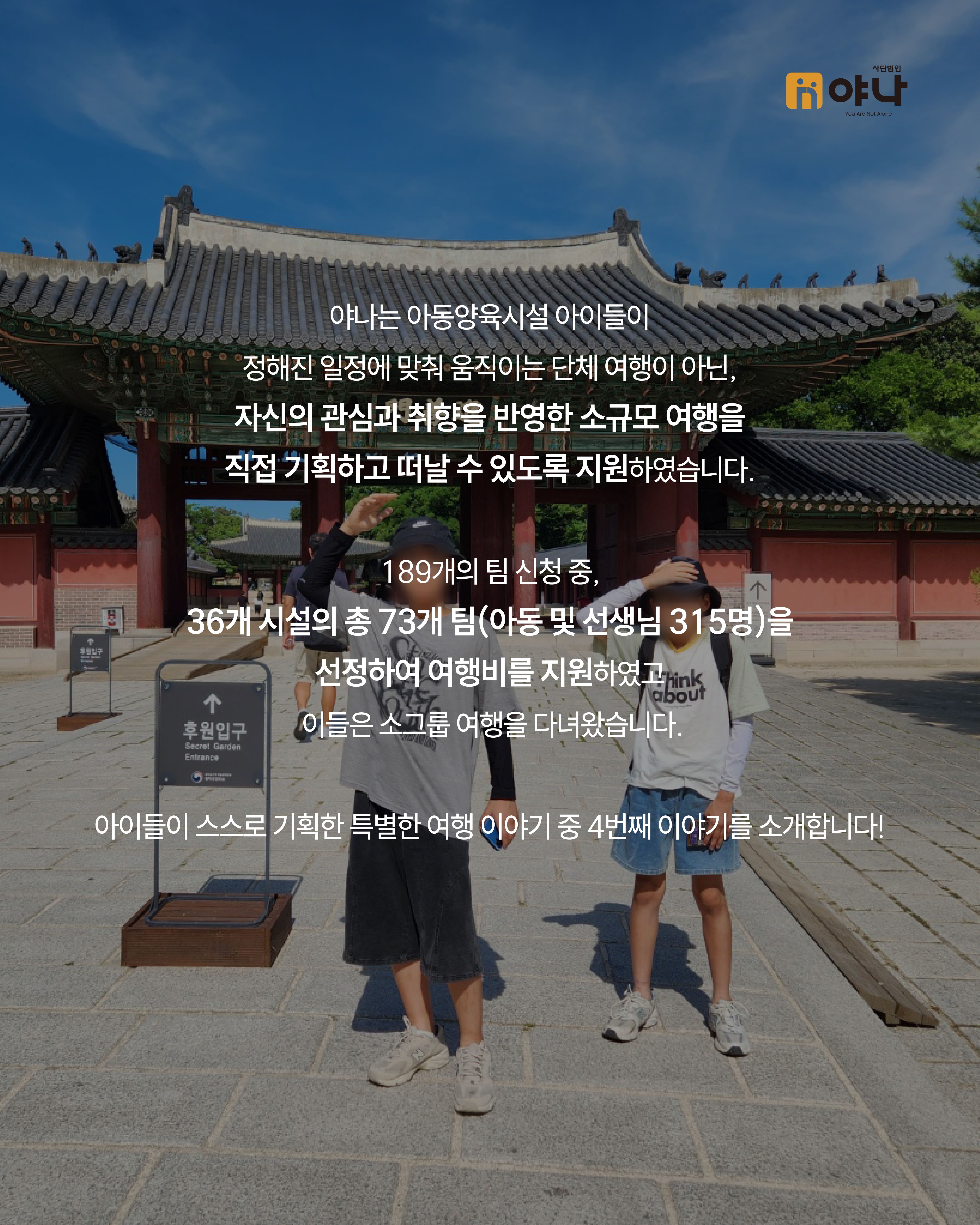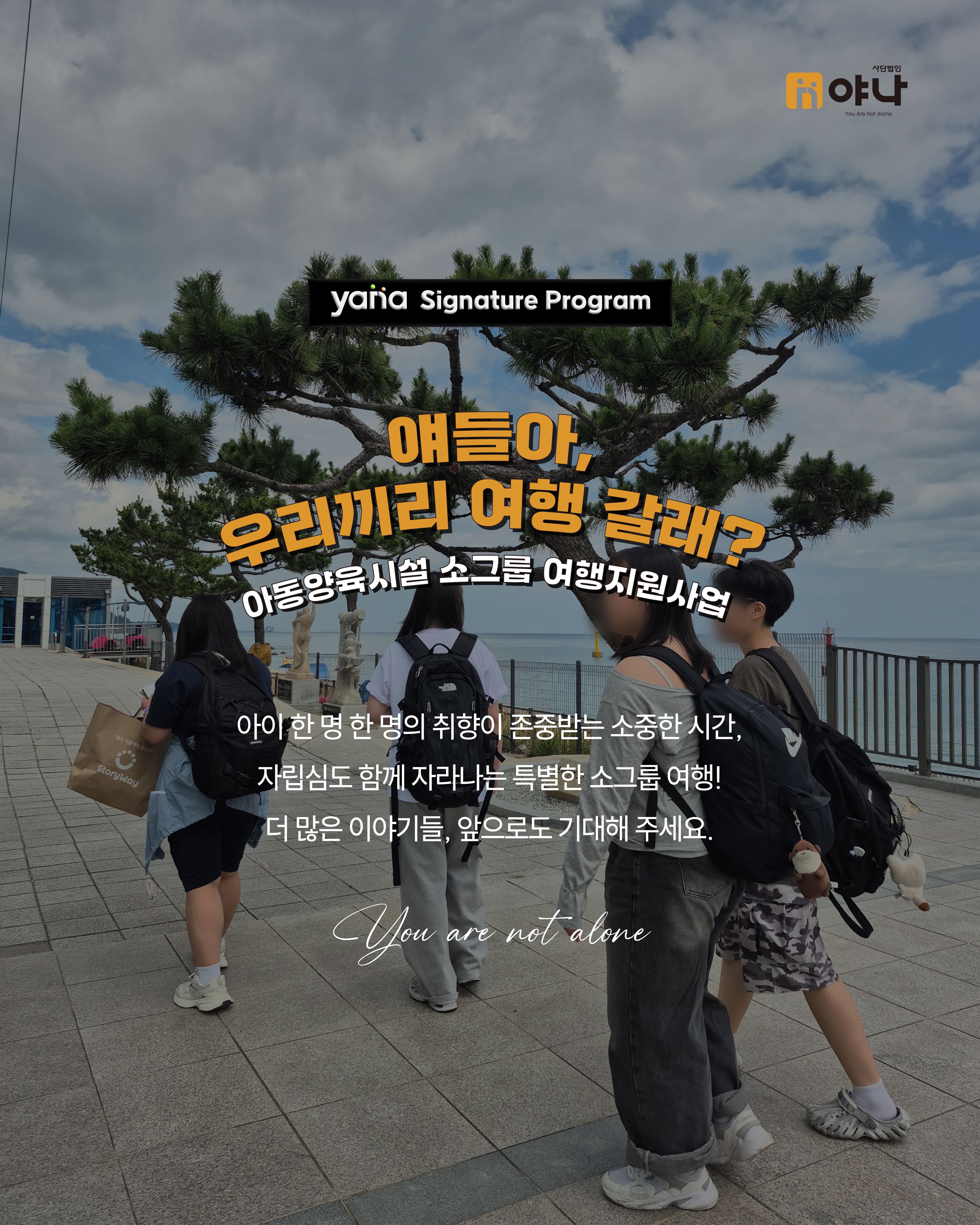 야나는 아동양육시설 아이들이 정해진 일정에 맞춰 움직이는 단체 여행이 아닌, 자신의 관심과 취향을 반영한 소규모 여행을 직접 기획하고 떠날 수 있도록 지원하였습니다.