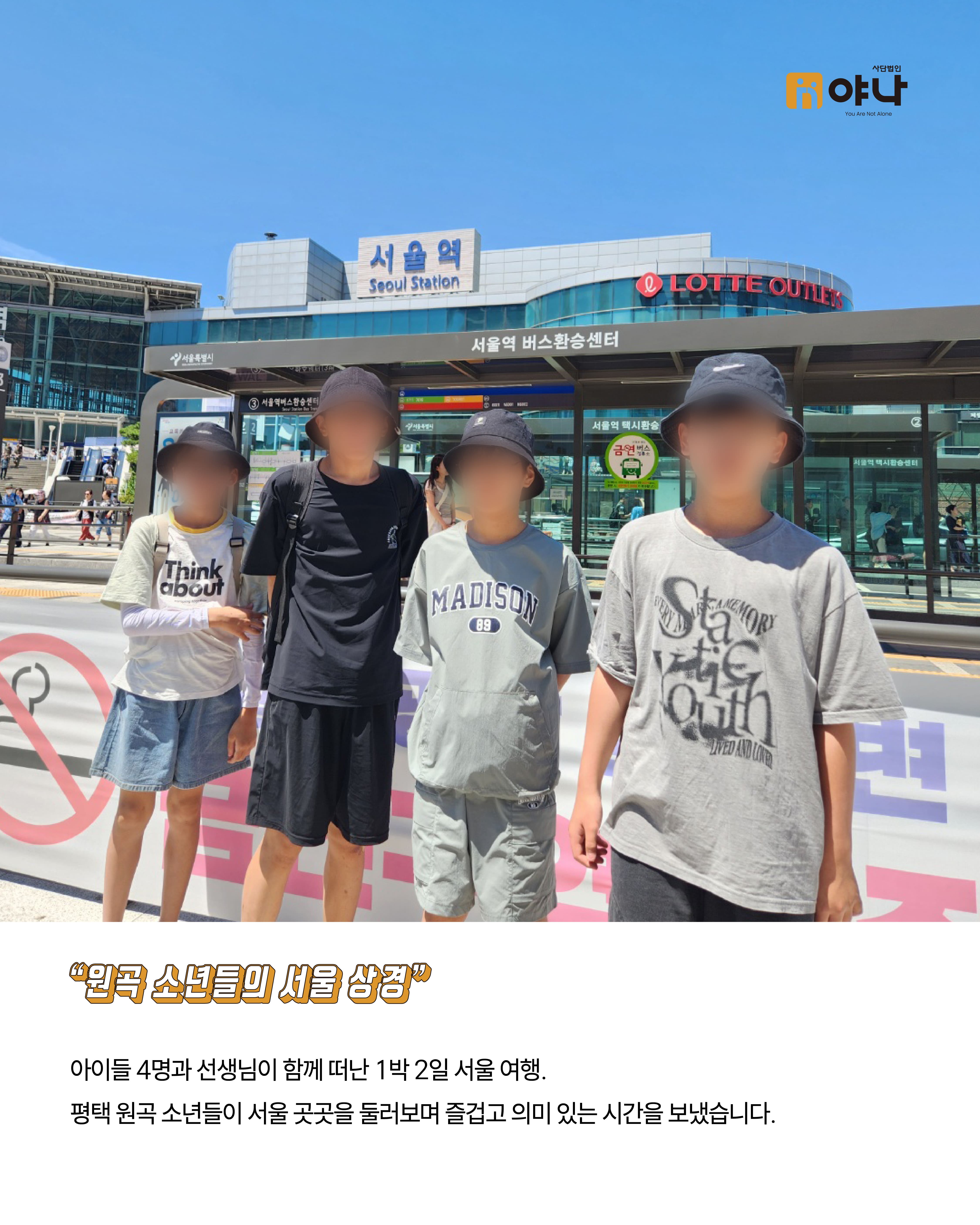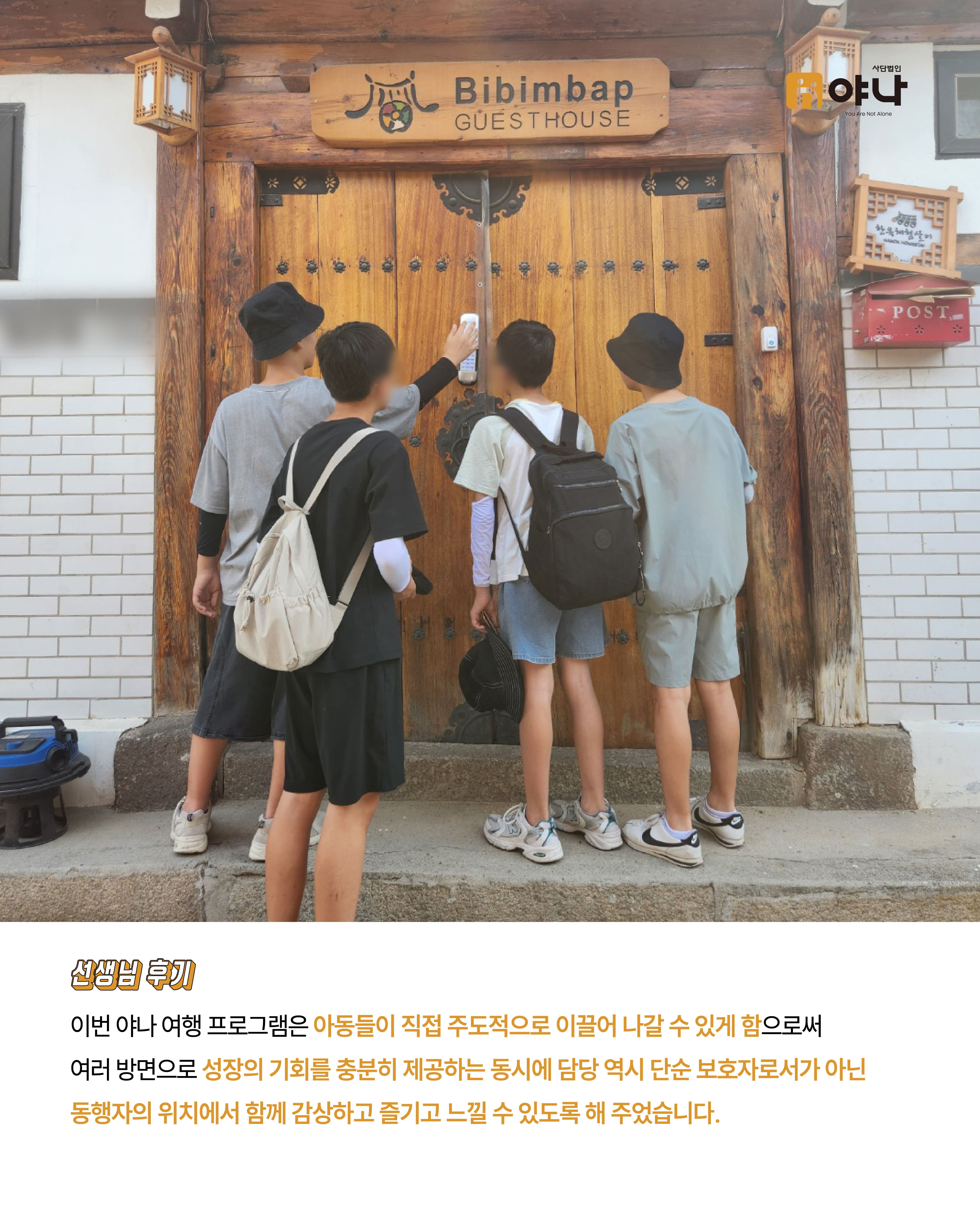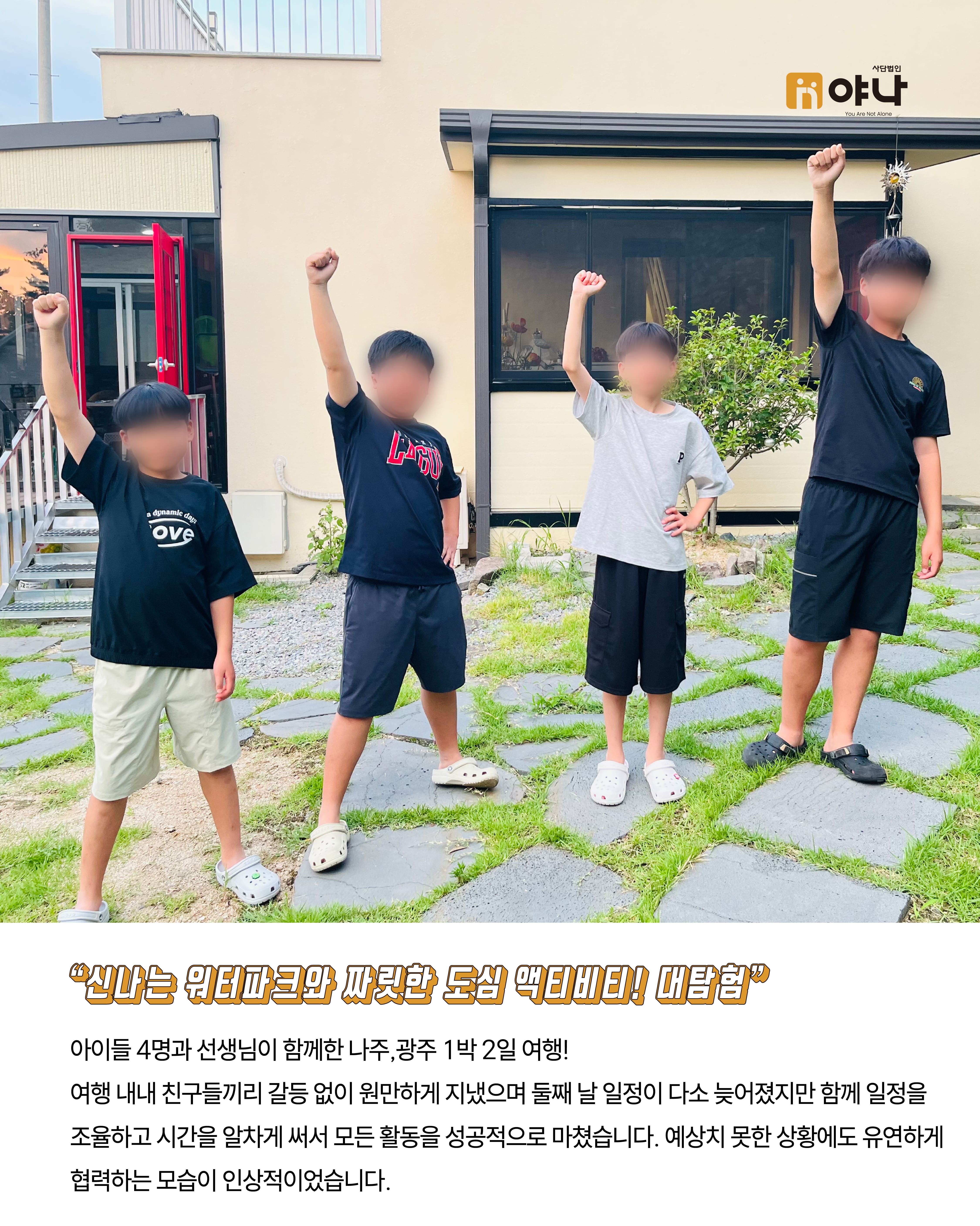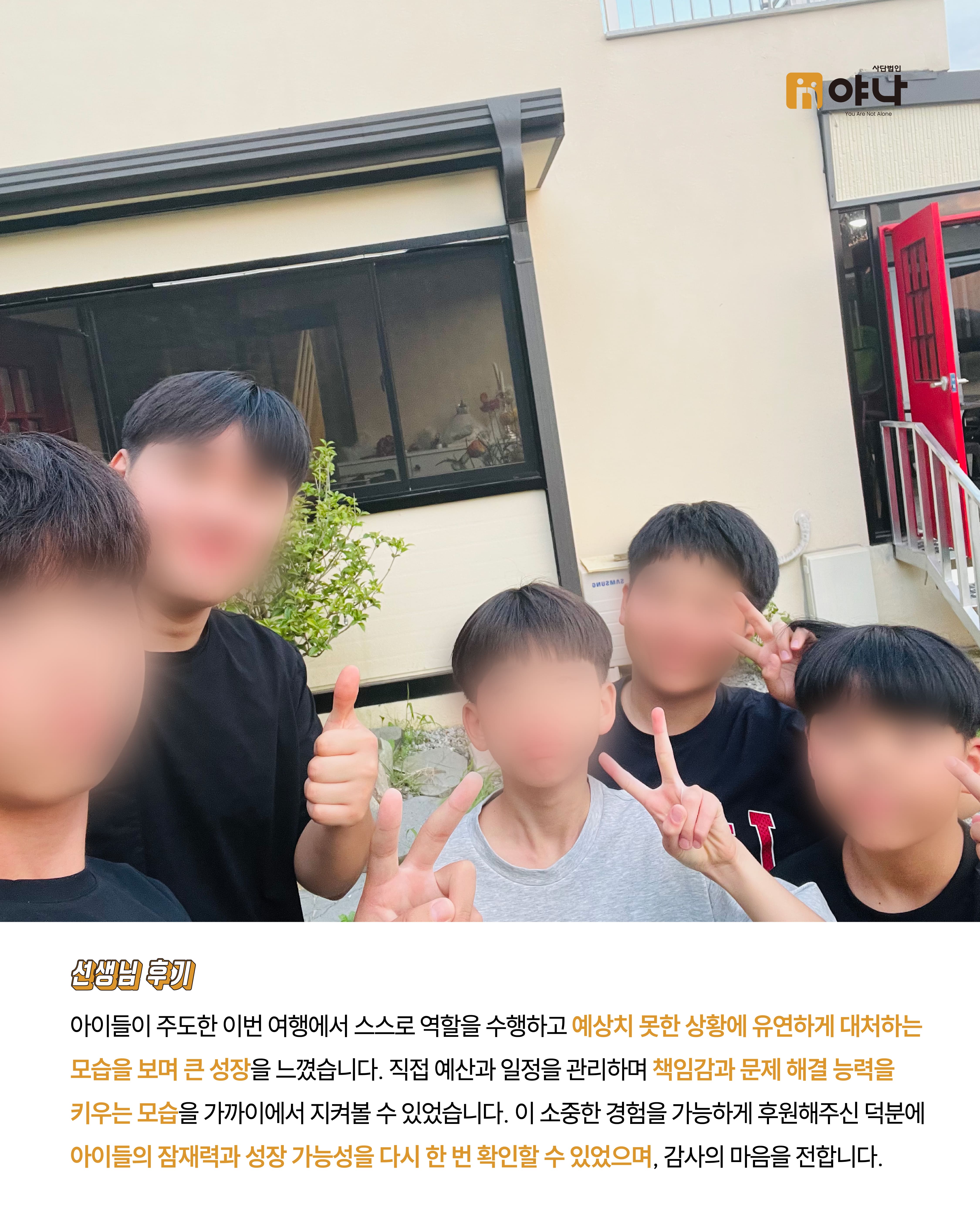 야나는 아동양육시설 아이들이 정해진 일정에 맞춰 움직이는 단체 여행이 아닌, 자신의 관심과 취향을 반영한 소규모 여행을 직접 기획하고 떠날 수 있도록 지원하였습니다.