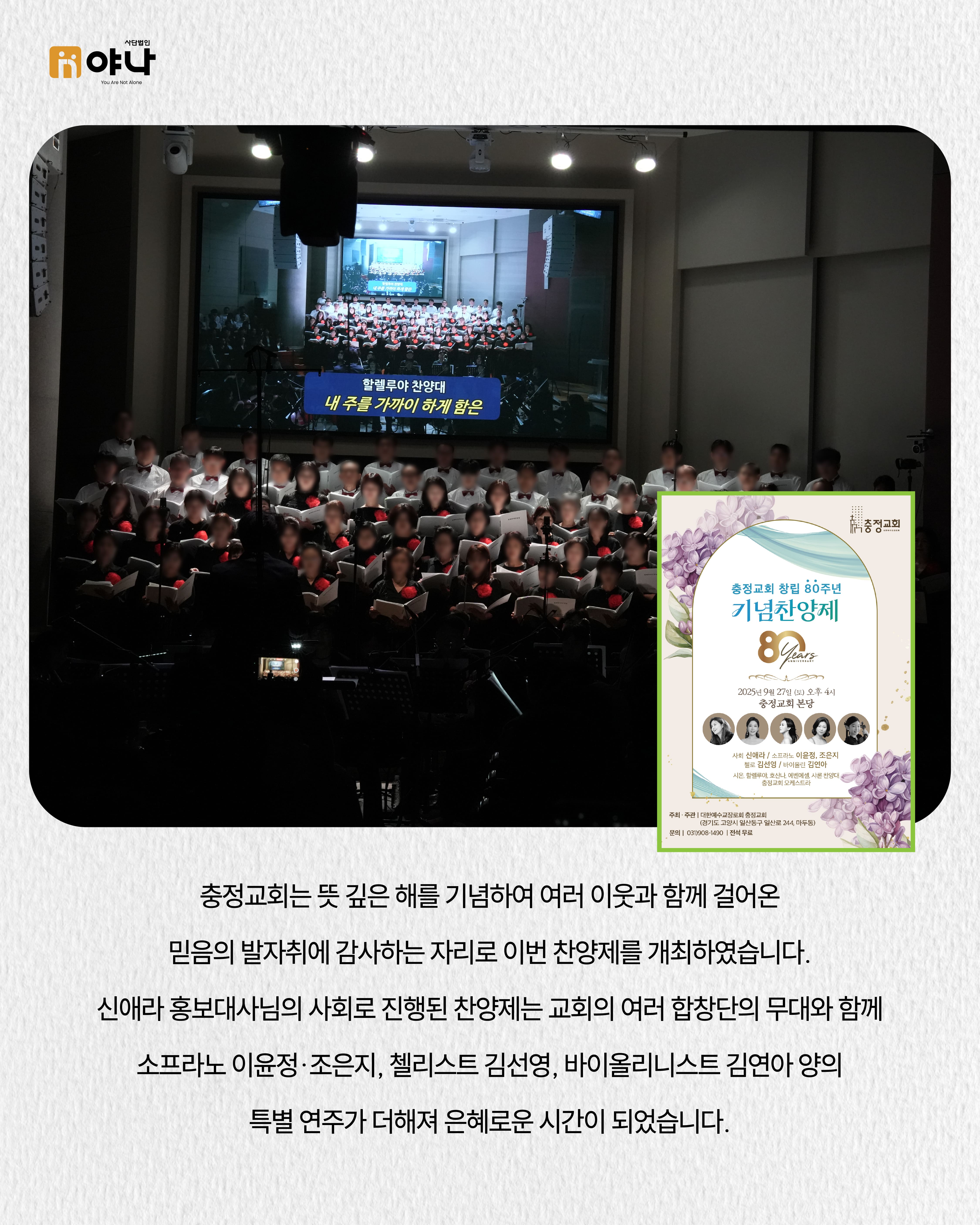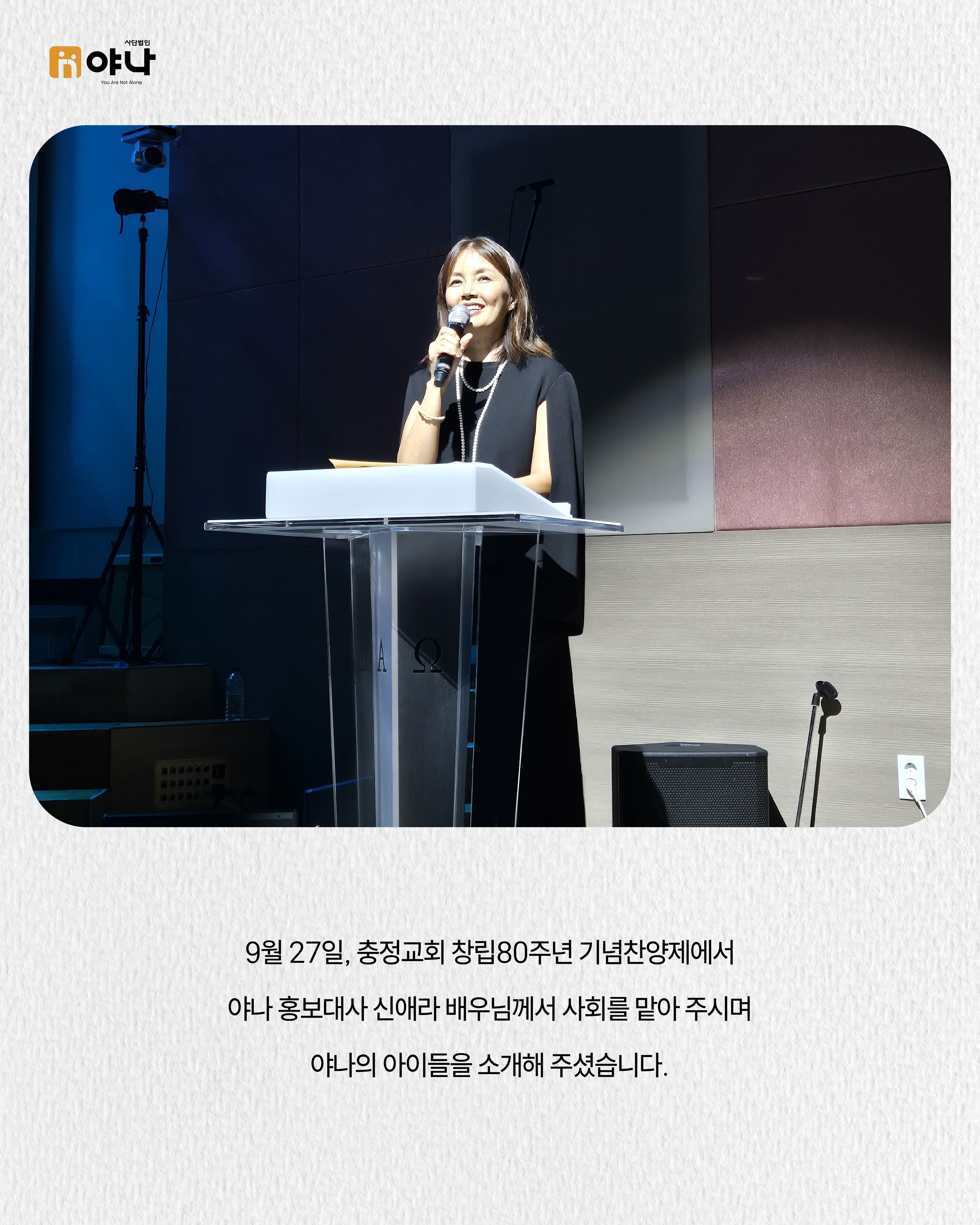 지난 9월 27일, 충정교회 창립80주년 기념찬양제에서 야나 홍보대사 신애라 배우님께서 사회를 맡아 주시며 야나의 아이들을 소개해 주셨습니다.