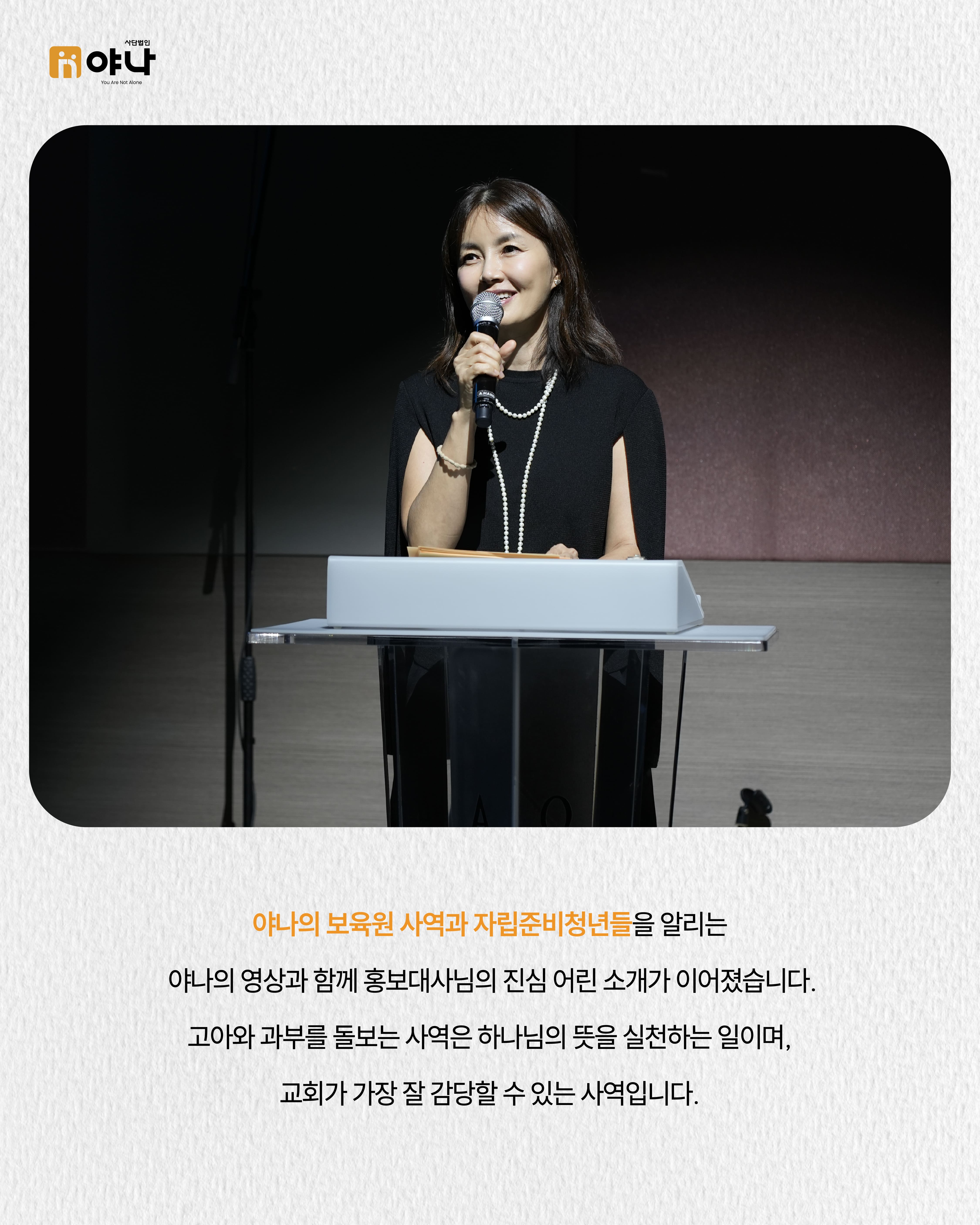 야나의 보육원 사역과 자립준비청년들을 알리는 야나의 영상과 함께 홍보대사님의 진심 어린 소개가 이어졌습니다.