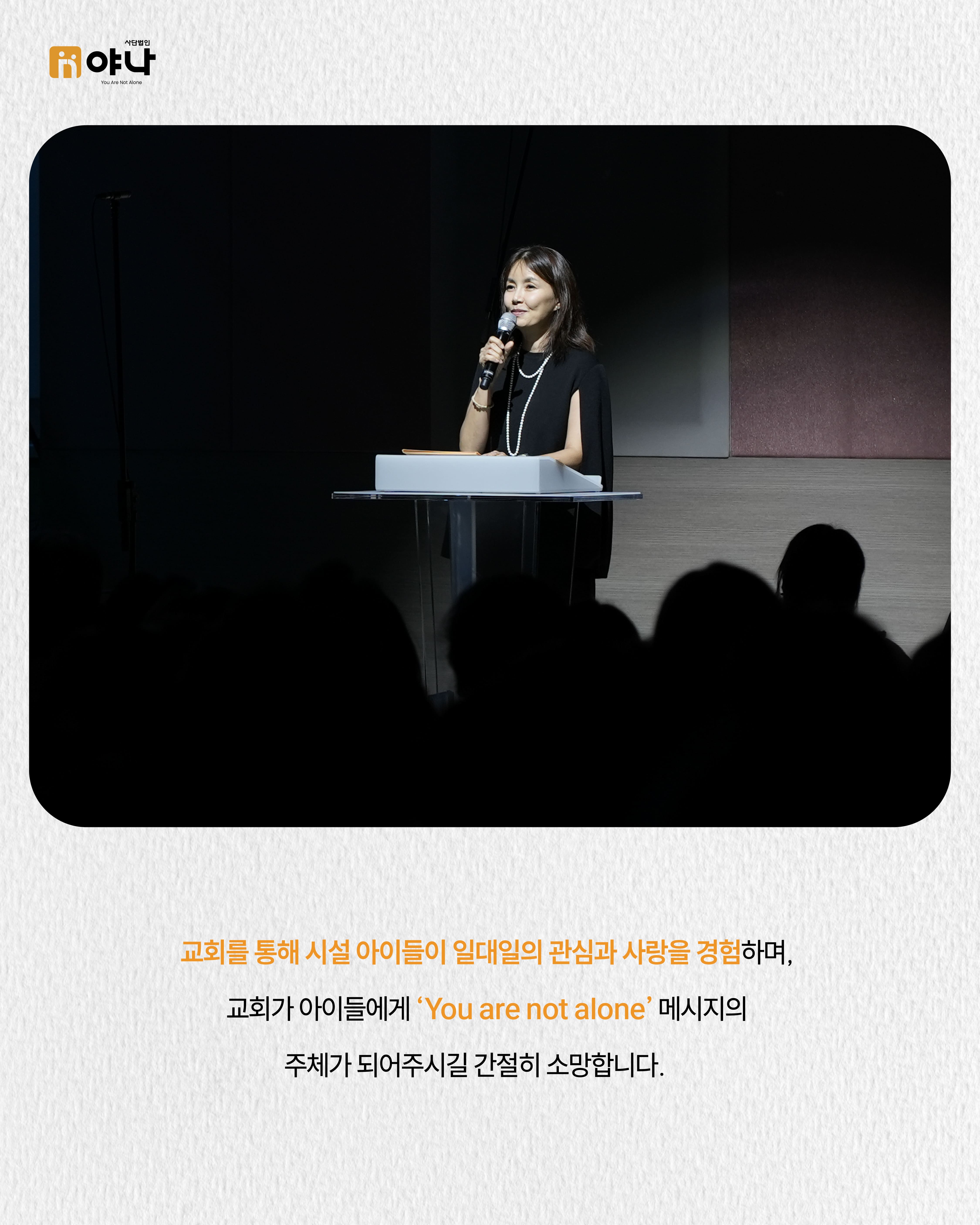 교회를 통해 시설 아이들이 일대일의 관심과 사랑을 경험하며, 교회가 아이들에게 'You are not alone' 메시지의 주체가 되어주시길 간절히 소망합니다.