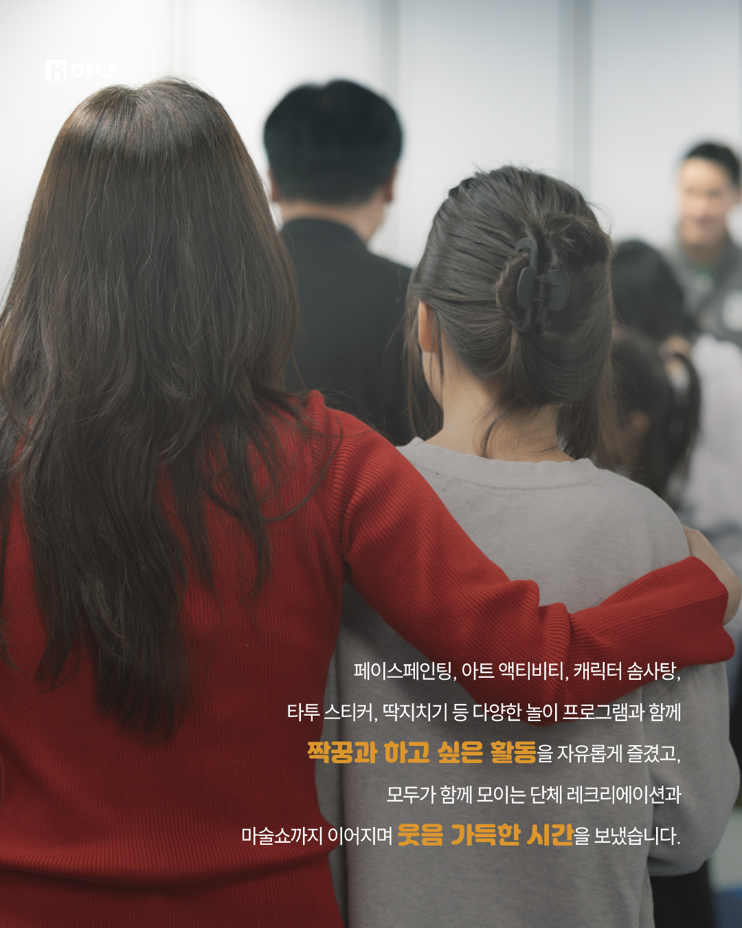 짝꿍과 하고 싶은 활동을 자유롭게 즐겼고, 모두가 함께 모이는 단체 레크리에이션과 마술쇼까지 이어지며 웃음 가득한 시간을 보냈습니다.