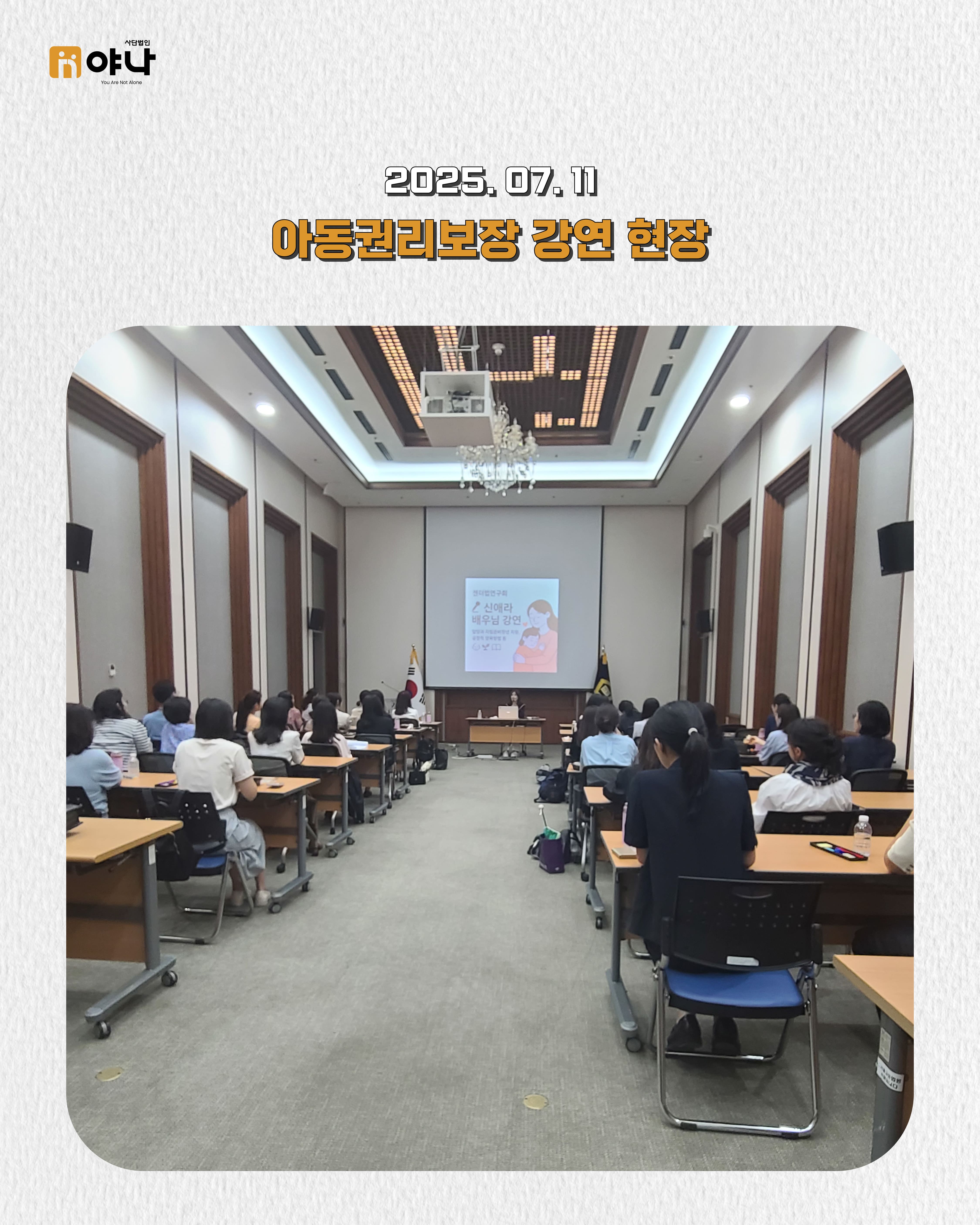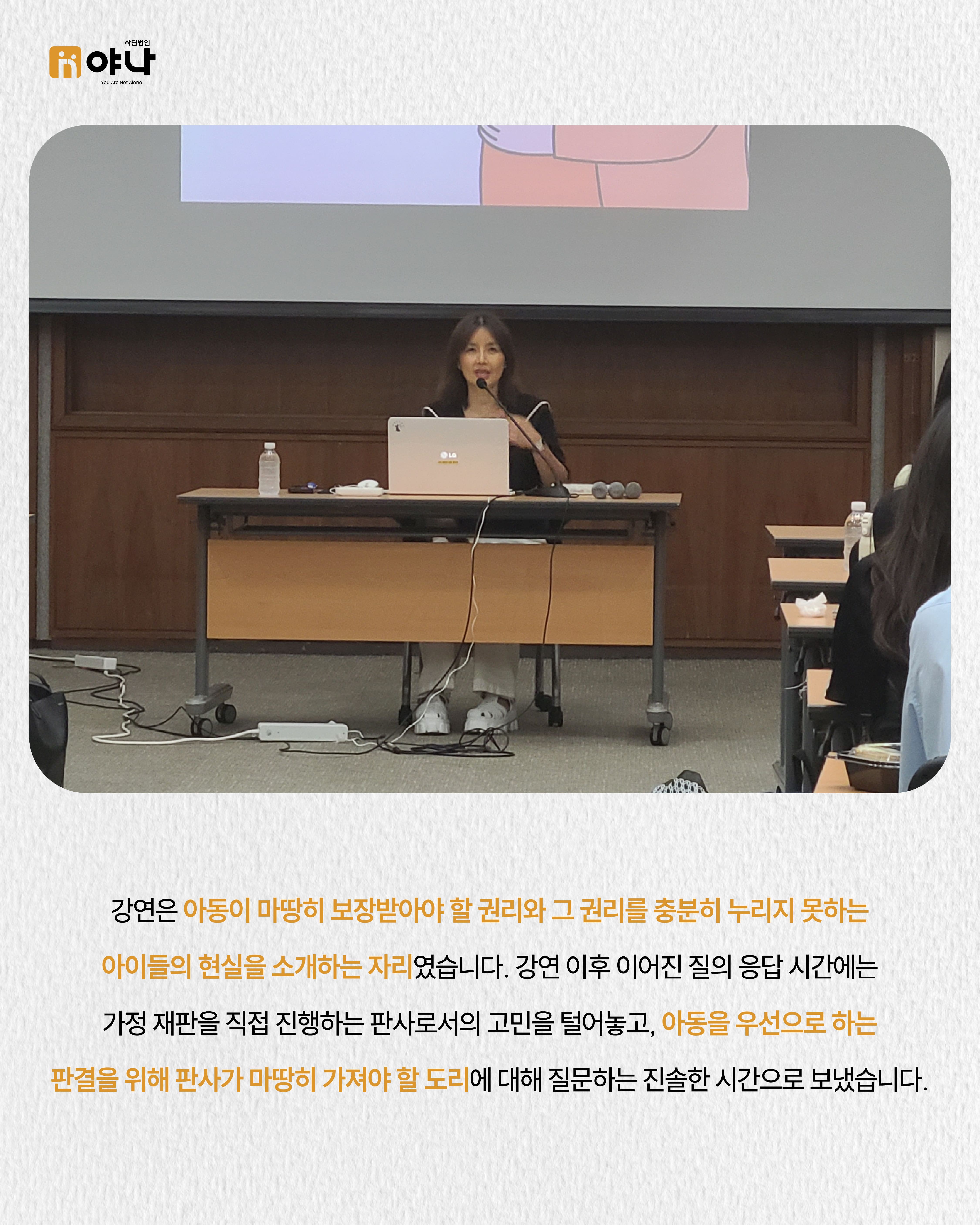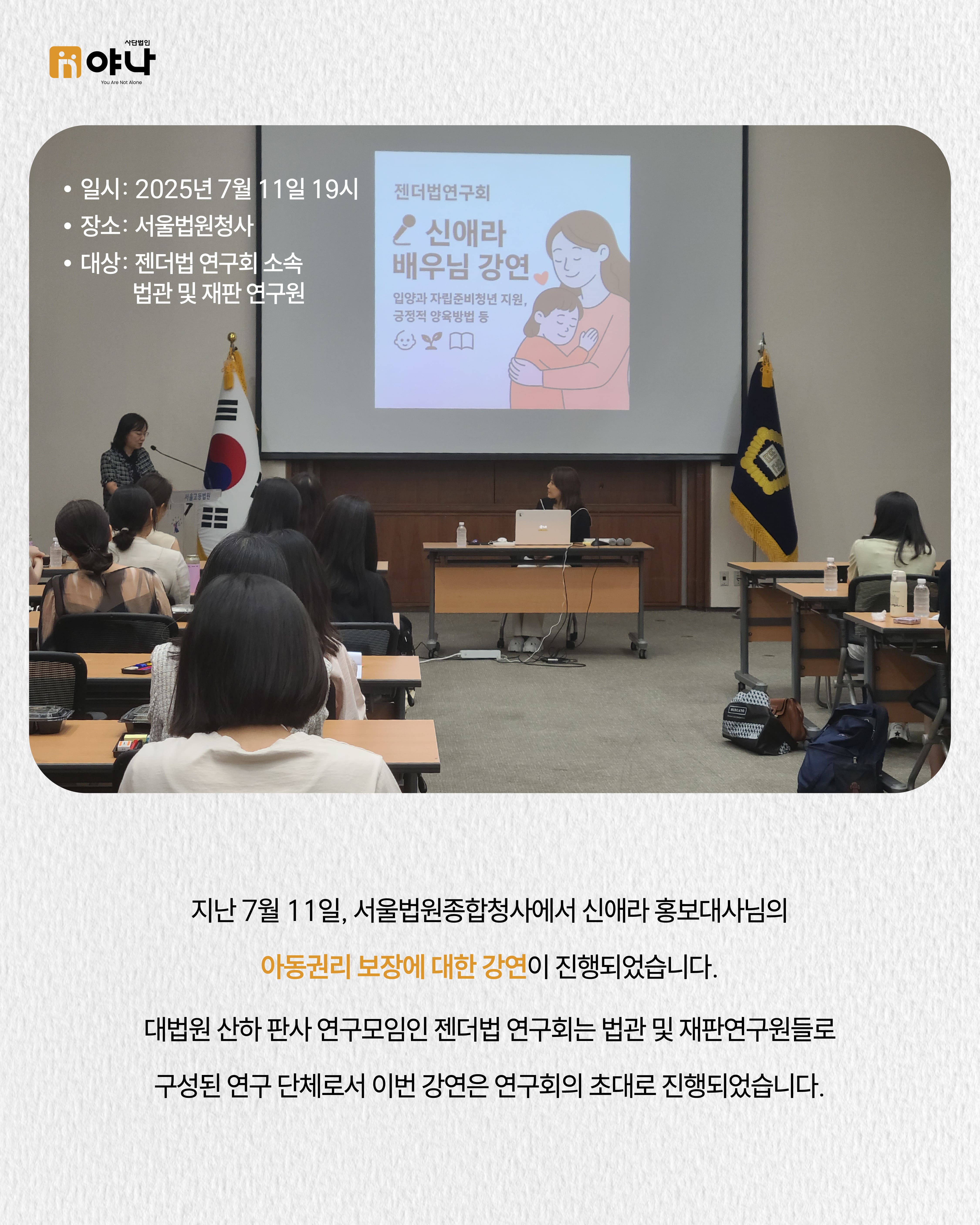 지난 7월 11일, 서울법원종합청사에서 신애라 홍보대사님의 아동권리 보장에 대한 강연이 진행되었습니다.