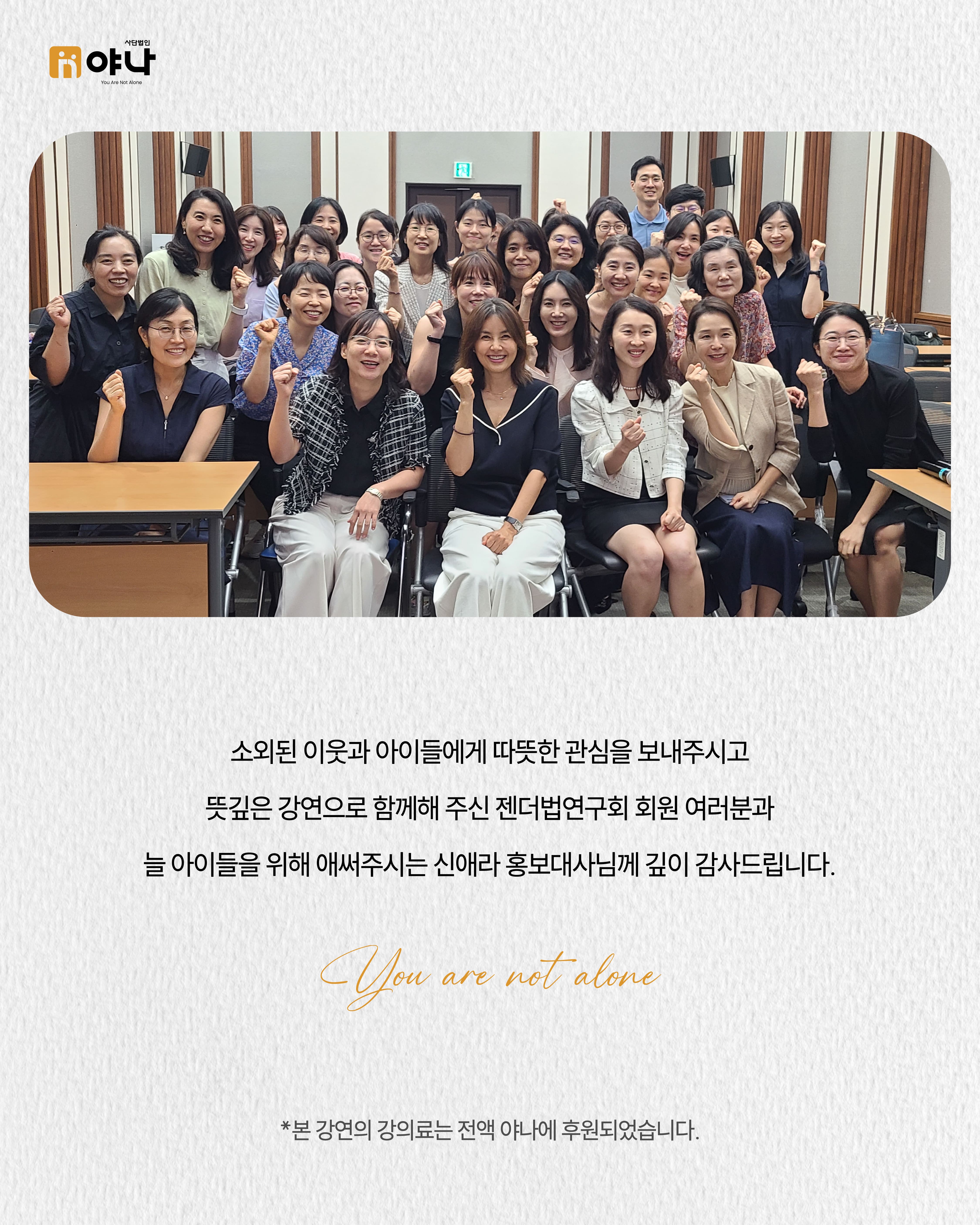 소외된 이웃과 아이들에게 따뜻한 관심을 보내주시고 뜻깊은 강연으로 함께해 주신 젠더법연구회 회원 여러분과 늘 아이들을 위해 애써주시는 신애라 홍보대사님께 깊이 감사드립니다.