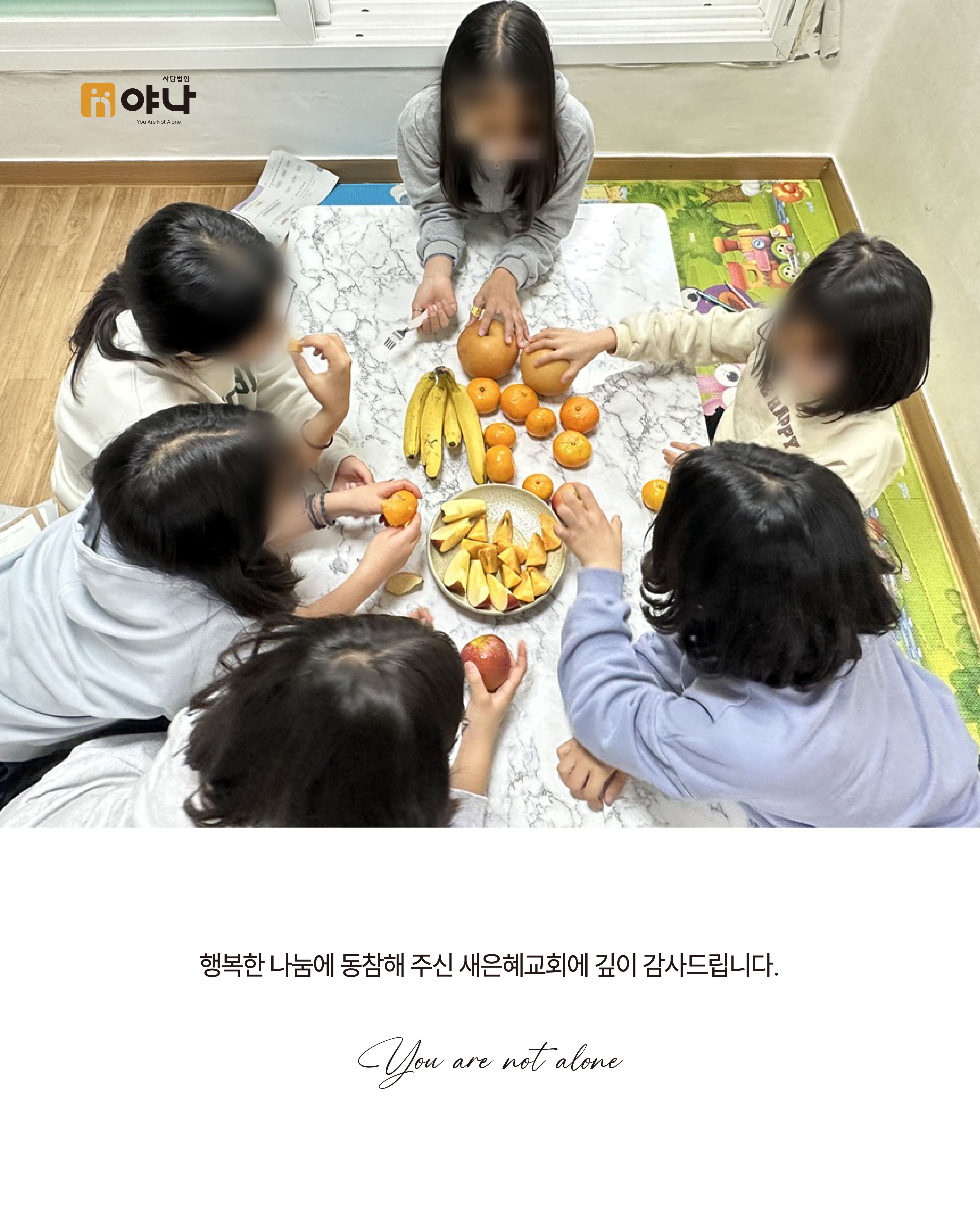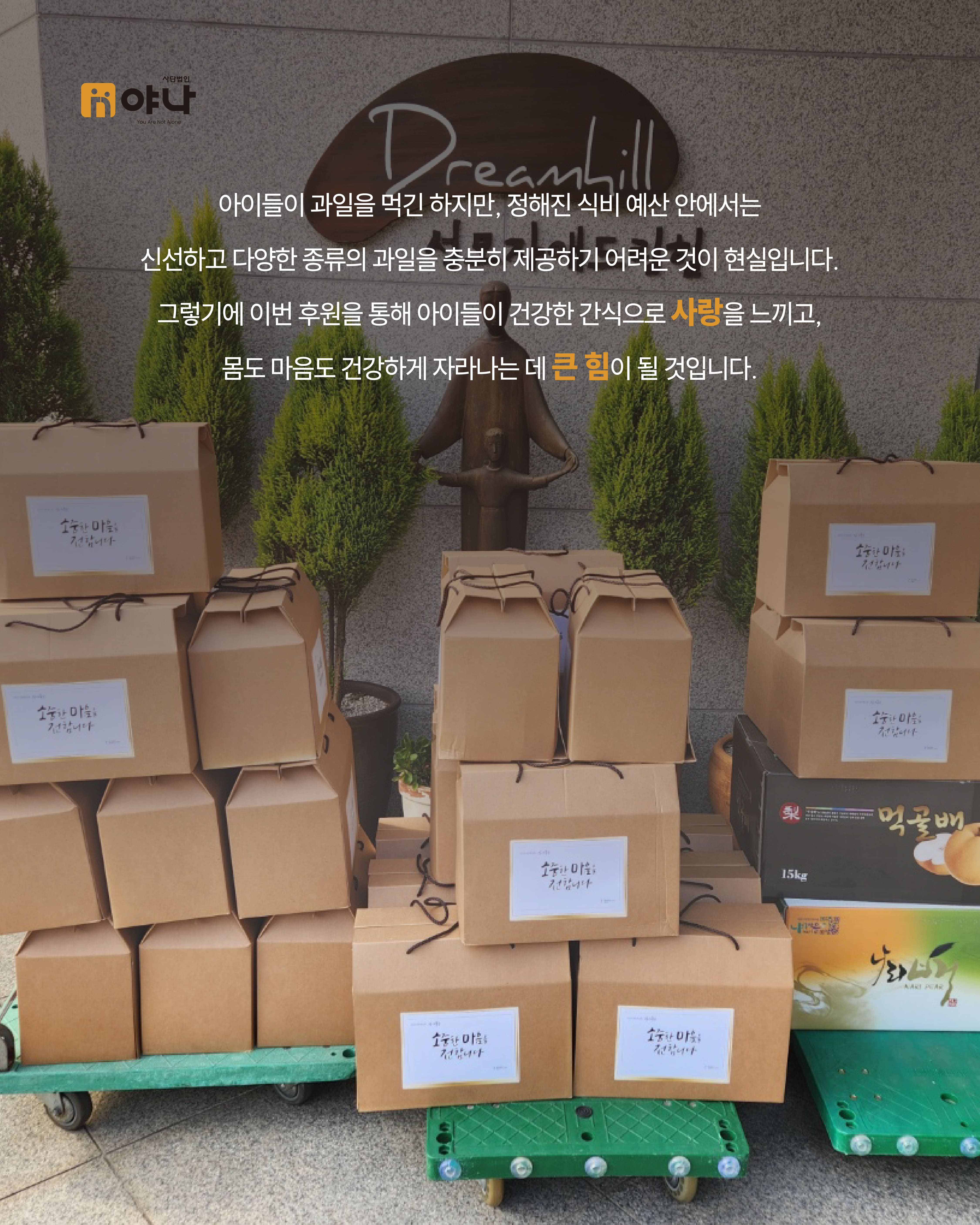 그렇기에 이번 후원으로 아이들이 건강한 간식으로 사랑을 느끼고, 몸도 마음도 건강하게 자라나는 데 큰 힘이 될 것입니다.