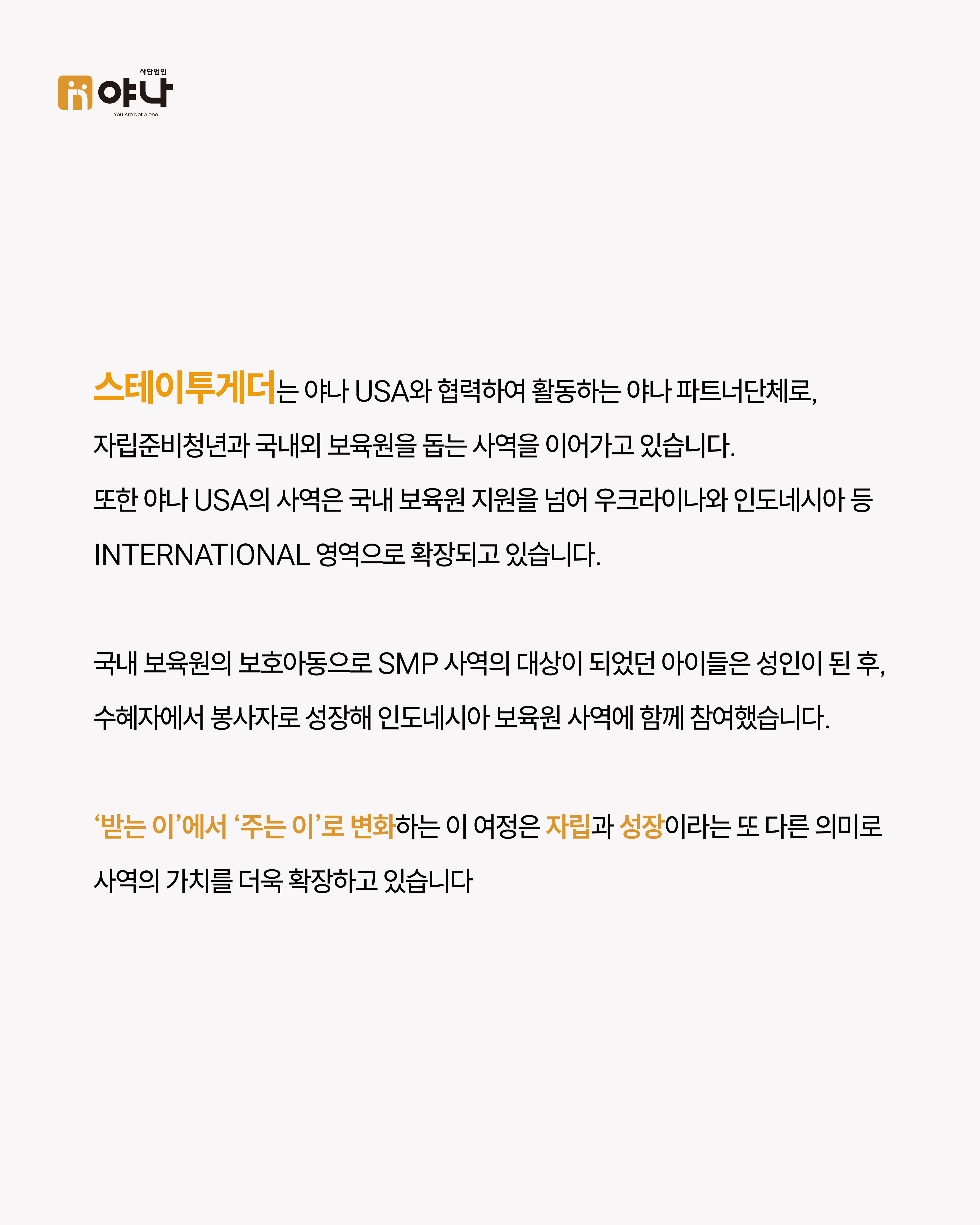 스테이투게더는 야나 USA와 협력하여 활동하는 야나 파트너단체로, 자립준비청년과 국내외 보육원을 돕는 사역을 이어가고 있습니다.