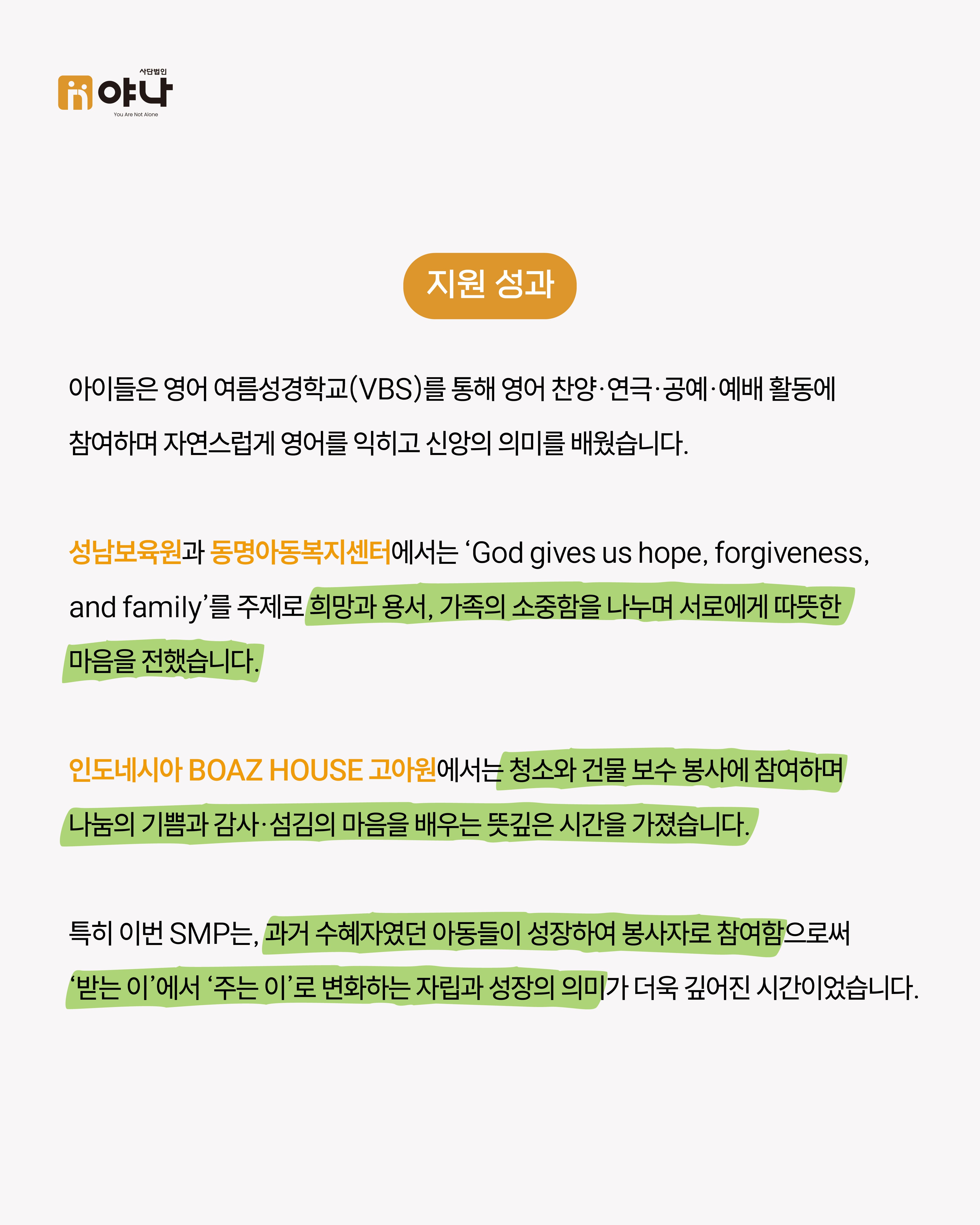 야나는 앞으로도 아이들의 성장과 자립을 위해 함께하겠습니다.