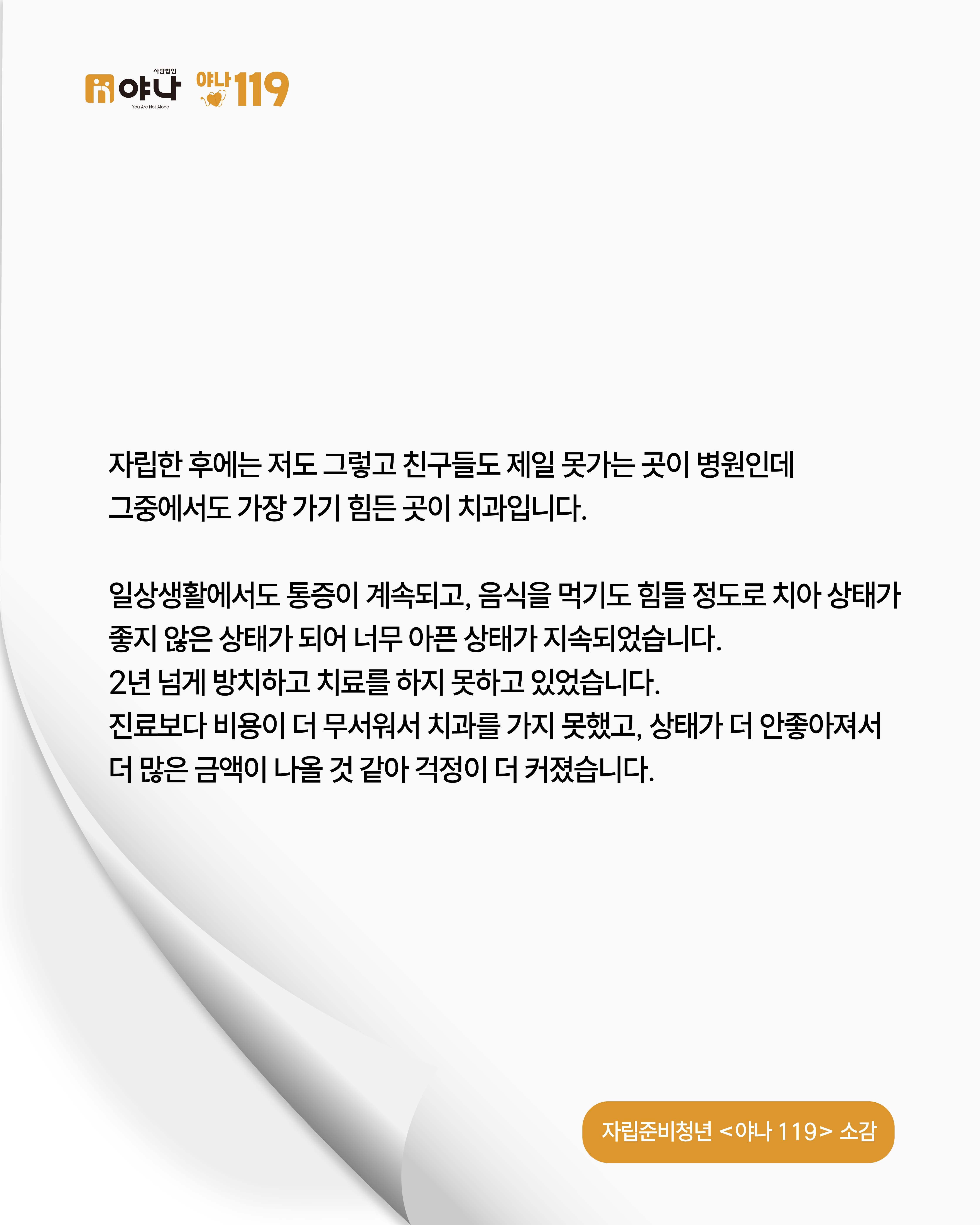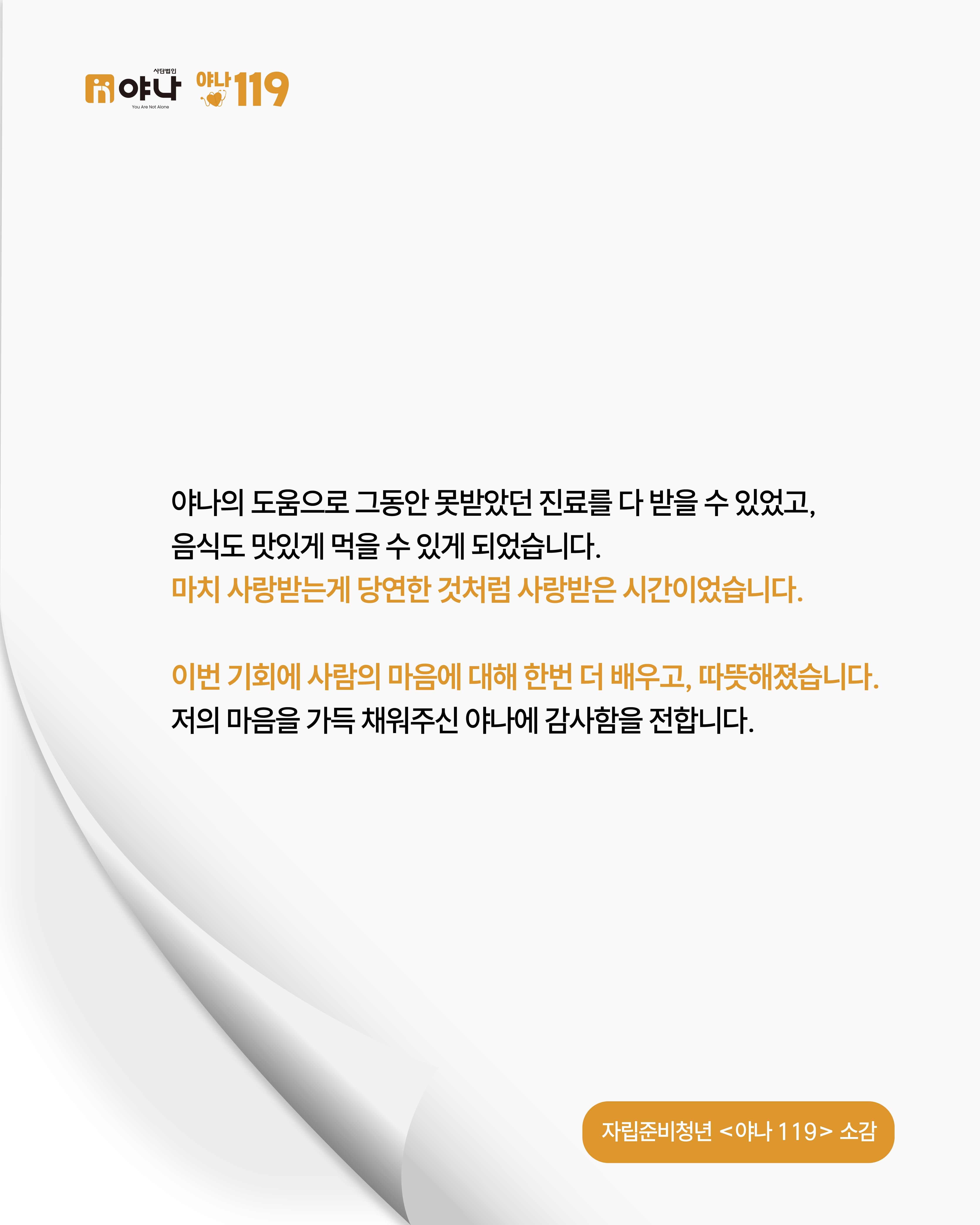 야나119를 통해 느낀 마음을 표현해 준 자립준비청년의 소감입니다.